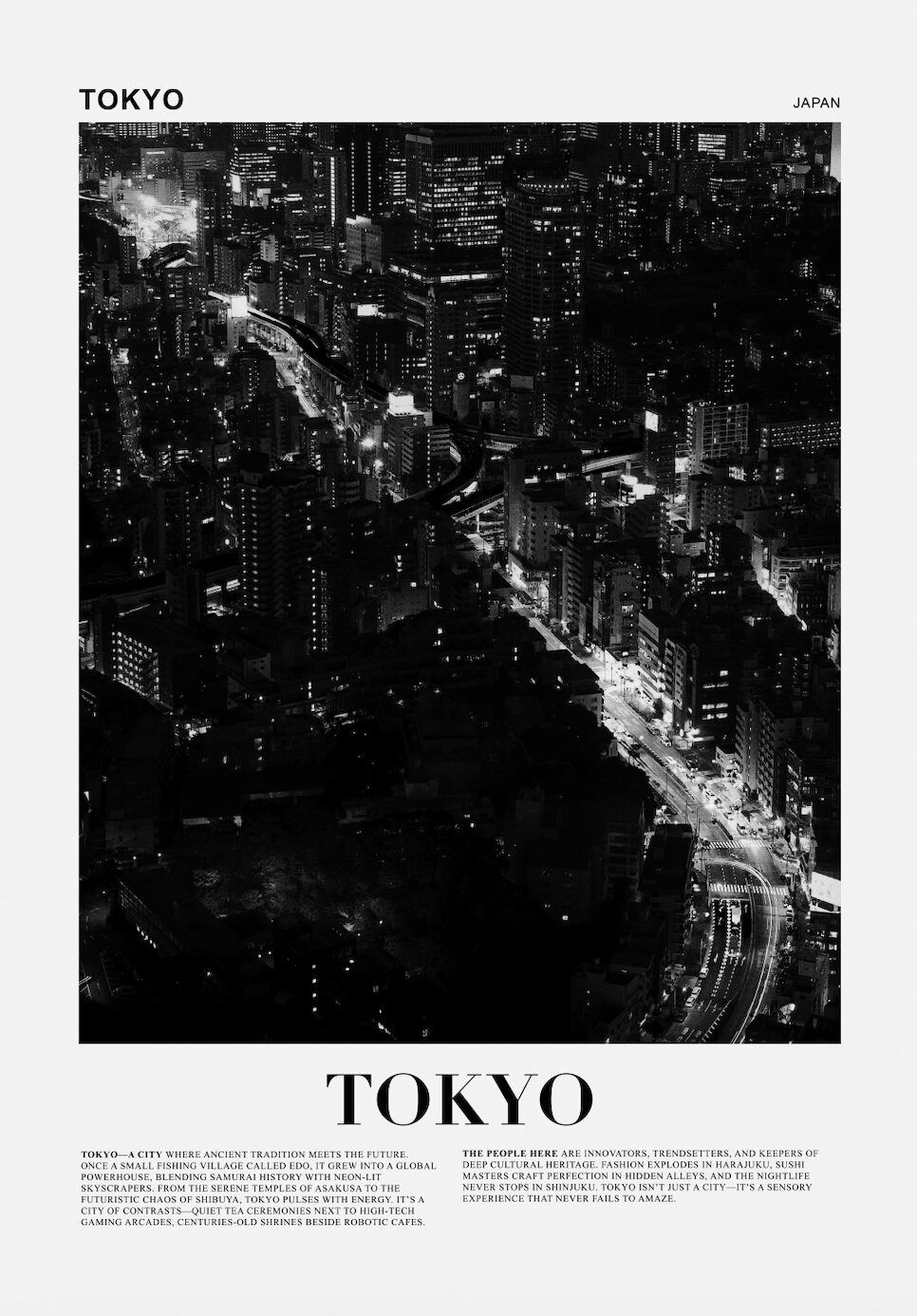 Tokyo är en av världens mest ikoniska storstäder, och dess karaktäristiska skyline gör sig perfekt på posters, affischer och prints. Våra Tokyo tavlor fångar stadens kontraster – från futuristiska skyskrapor i Shinjuku och Shibuya till historiska tempel som Senso-ji i Asakusa. För en stilren och minimalistisk känsla finns svartvita Tokyo posters, medan färgglada neonmotiv kan skapa en levande och energisk känsla i rummet.