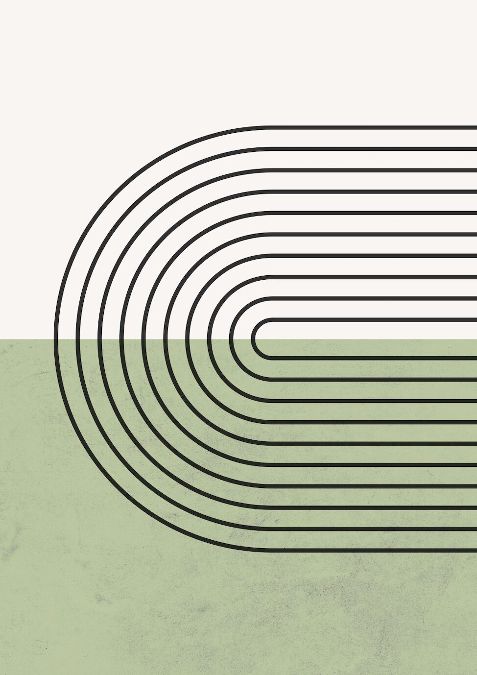 Bakgrunden är delad i två sektioner: den övre delen i en mjukt vit ton och den undre delen i en dämpad grön nyans med subtil textur. Kombinationen av de rena linjerna och den lugna färgskalan ger postern ett stilrent, skandinaviskt uttryck som är både tidlöst och modernt.