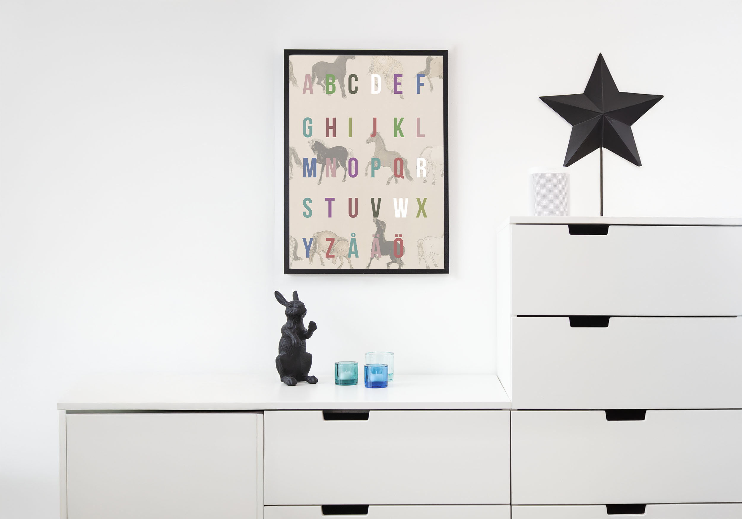 Bilden visar en stilren och minimalistisk illustration av det svenska alfabetet. Varje bokstav är placerad framför en silhuett av en häst, tecknad i en klassisk och elegant stil. Hästarna är mångfacetterade och har olika färger och positioner, vilket skapar en dynamisk och intressant komposition. Bakgrunden är en mjuk, beige färg som framhäver de svarta hästsiluetterna och de färgglada bokstäverna.