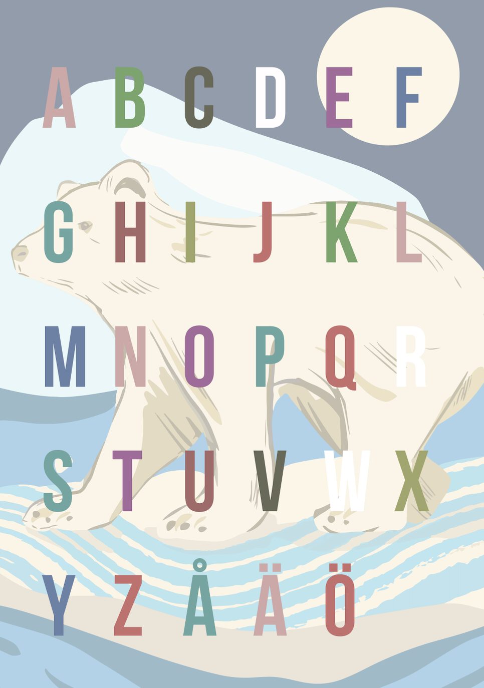 Bilden visar en stilren och minimalistisk illustration av det svenska alfabetet. Varje bokstav är placerad framför en silhuett av en isbjörn, tecknad i en klassisk och elegant stil. Isbjörnen är mångfacetterad och har olika färger och positioner, vilket skapar en dynamisk och intressant komposition. Bakgrunden är en mjuk, blå färg som framhäver de vita isbjörnssiluetterna och de färgglada bokstäverna.