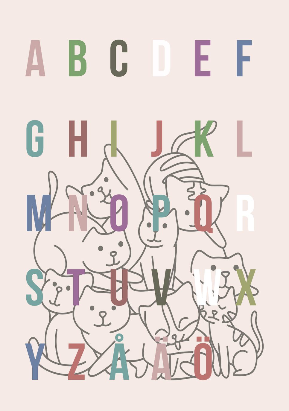 En illustration av det svenska alfabetet. Varje bokstav är placerad bredvid en katt tecknad i olika färger. Bakgrunden är ljus och enkel.