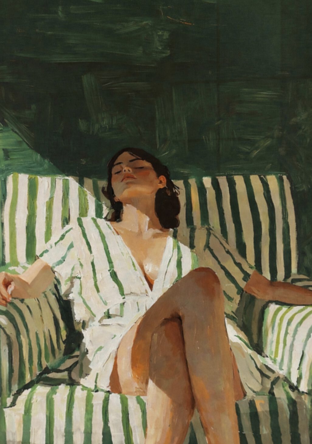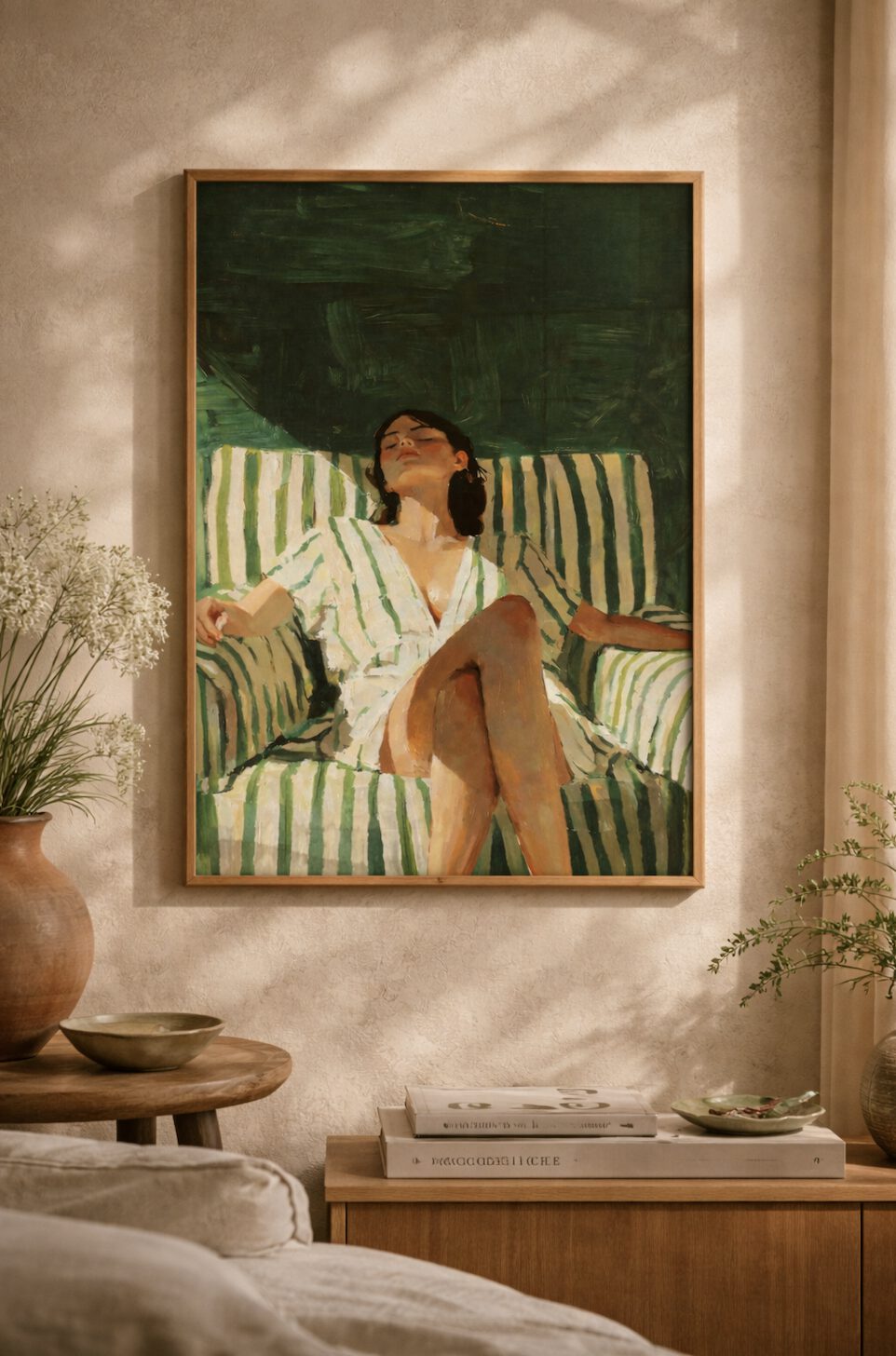 Denna poster visar en solvarm stund av total avkoppling. En kvinna sitter tillbakalutad i en grön- och vitrandig fåtölj, med armarna vilande längs sidorna och ansiktet vänt upp mot ljuset. Hon bär en lätt, vit klänning med gröna ränder som smälter samman med fåtöljens tyg, vilket skapar ett harmoniskt och nästan monokromt uttryck. Ljuset faller mjukt över huden och framhäver varma toner i ben och ansikte, medan bakgrunden består av djupa gröna penseldrag som ger målningen ett levande och konstnärligt djup. Motivet förmedlar känslan av en varm sommardag, stillhet, vila och lugn. Tavlan passar mycket fint i vardagsrum, sovrum, walk-in closet, hotellinspirerad inredning eller i ett sommarhus där man vill skapa en avslappnad och elegant atmosfär.