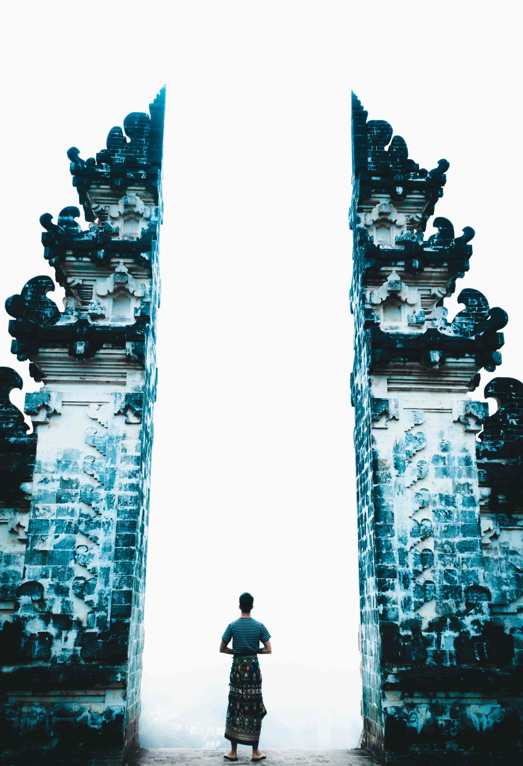 Bilden fångar ett ögonblick av mystik och lugn vid ett balinesiskt tempel. I förgrunden syns en smal, mörk figur som står mitt i ett magnifikt tempelport. Porten, gjord av grå sten och prydd med intrikata mönster, öppnar sig som två stora dörrar mot en värld bortom. Ljuset faller in genom porten och skapar en nästan overklig atmosfär. Färgerna är dämpade, med blå toner som dominerar och ger bilden en känsla av svalka och andlighet. Bakgrunden är något oskarp, vilket bidrar till att fokusera betraktarens blick på figuren och porten.