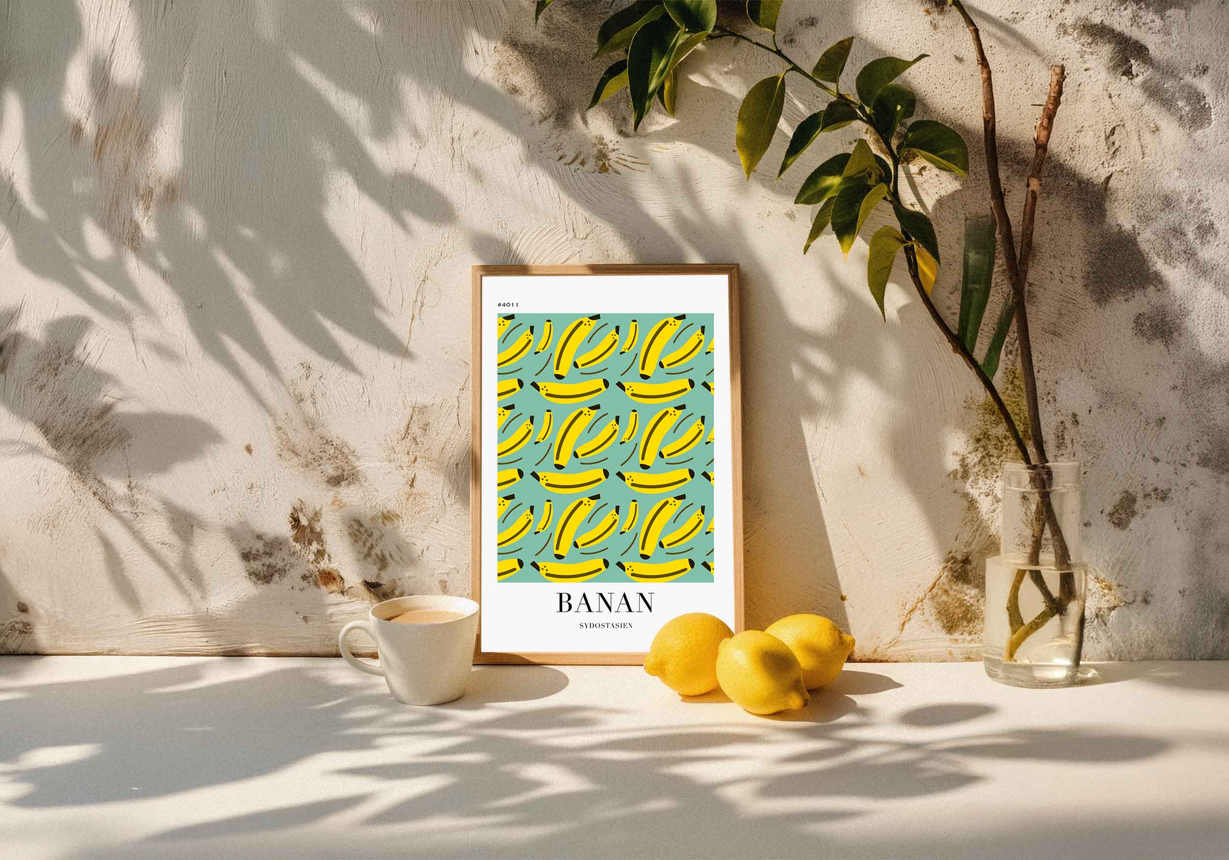 Poster som visar En enkel, stiliserad illustration av bananer på en turkos bakgrund. Texten "BANAN" och "SYDOSTASIEN" finns under bilden.