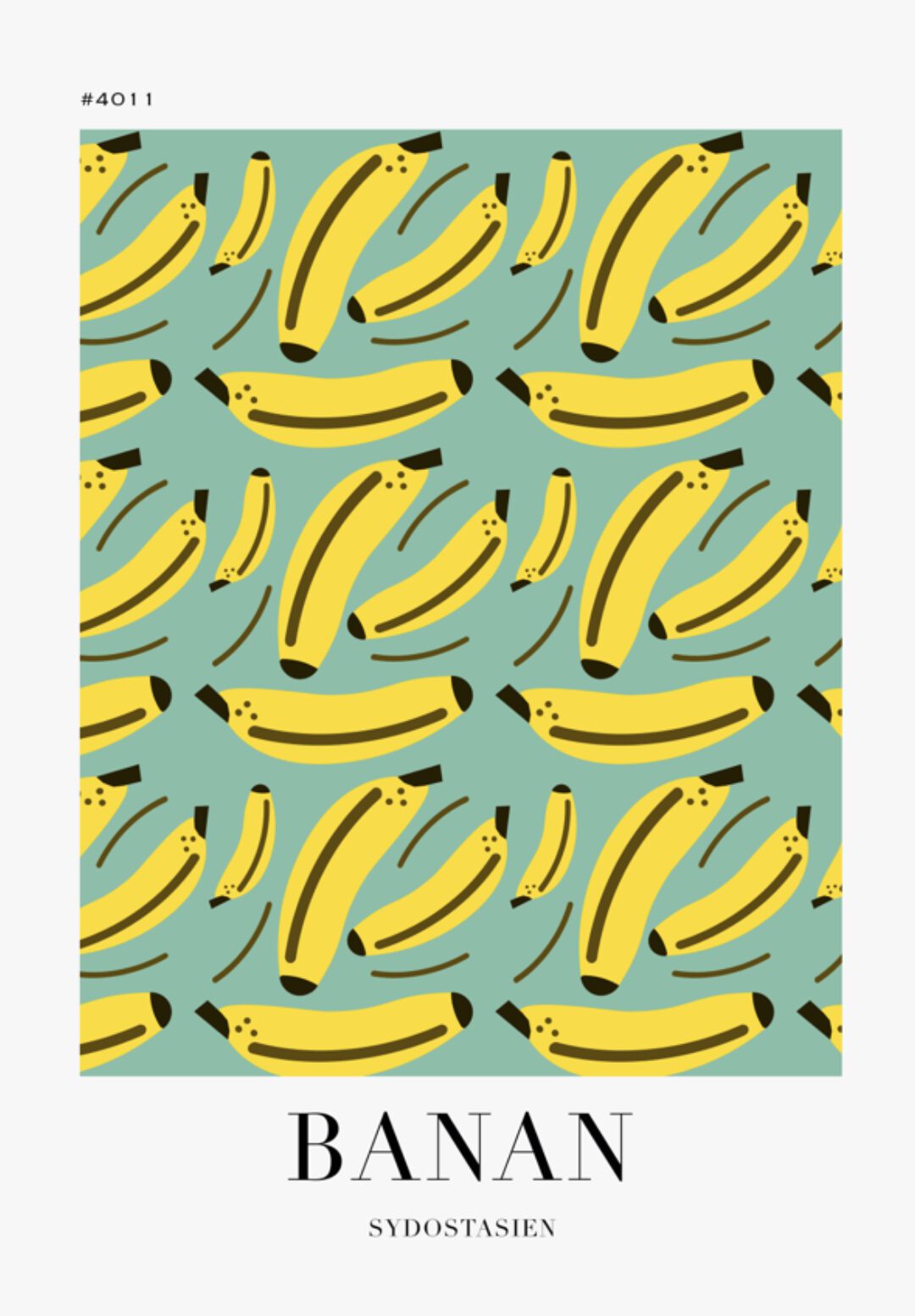Bilden är en minimalistisk och färgglad illustration av bananer. Mot en ljus turkos bakgrund finns ett repetitivt mönster av gula bananer. Bananerna är stiliserade och har en enkel form, men är ändå lätt att känna igen. Ordet ”BANAN” och texten ”SYDOSTASIEN” är placerade under mönstret i ett modernt typsnitt.