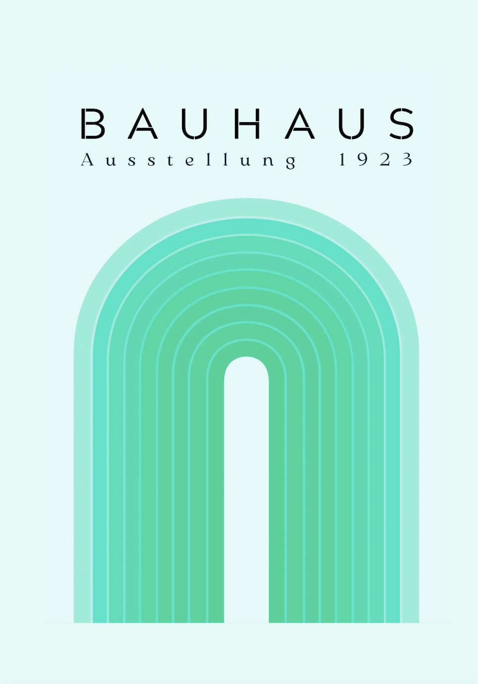 En ljus mintgrön Bauhaus-poster med texten "BAUHAUS Ausstellung 1923" överst, och nedtill ett stort motiv av koncentriska gröna och turkosa bågformade linjer med färggradient.