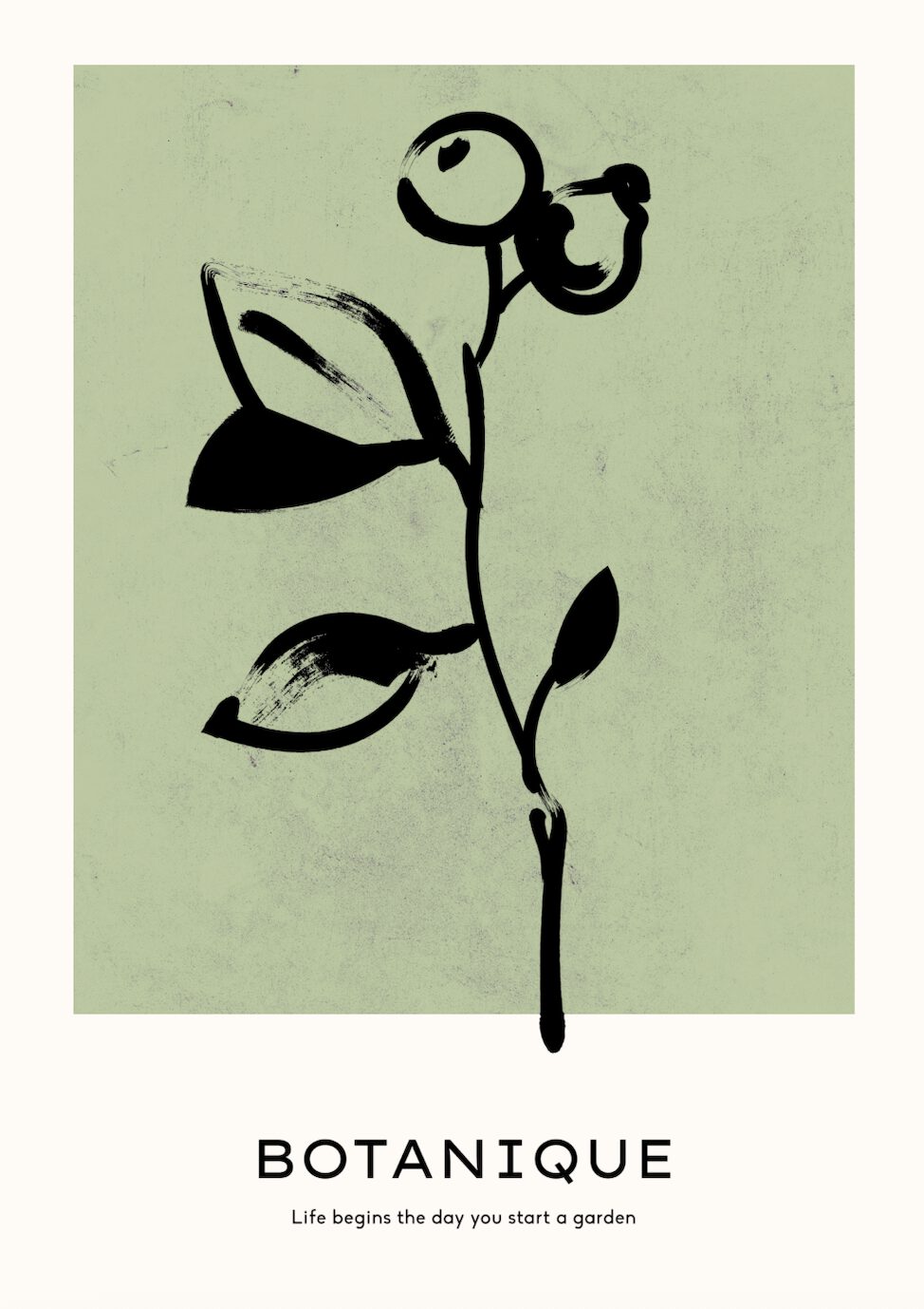Denna poster har en stilren och minimalistisk design med fokus på naturens enkelhet. Mot en mjukt grön bakgrund avbildas en växt i svart tuschstil – med en tunn stam, blad i olika former och två runda bär eller knoppar längst upp. Illustrationens penseldrag är råa och organiska, vilket ger motivet en konstnärlig och handmålad känsla.