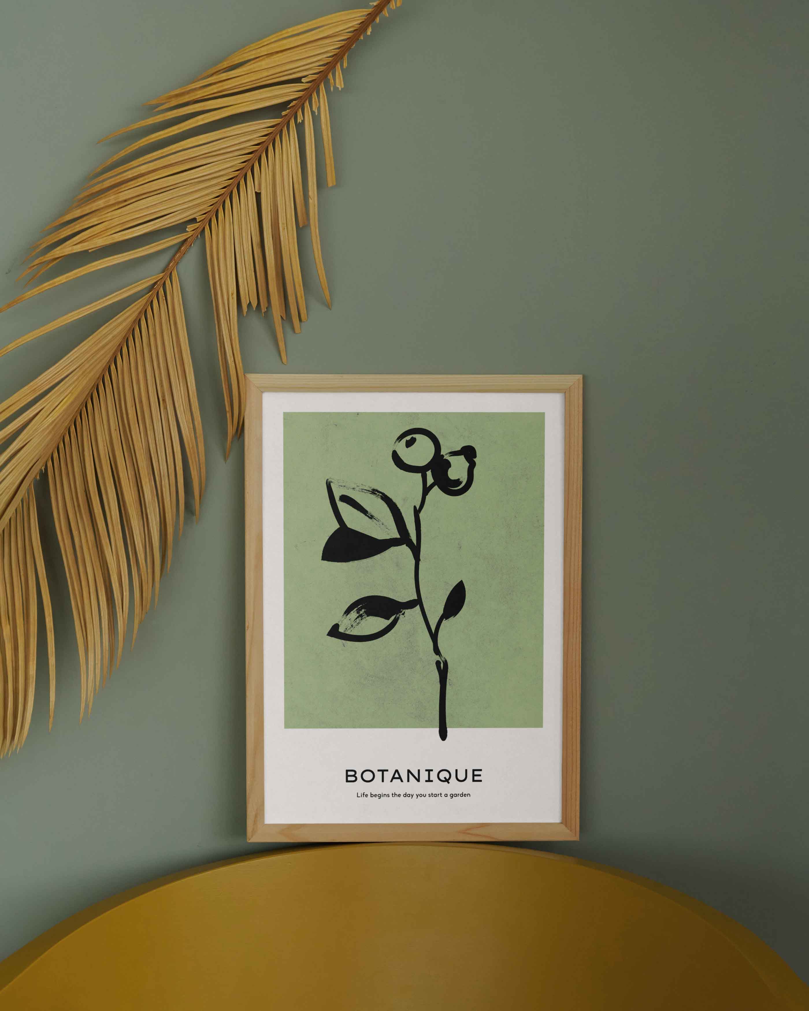 Under motivet står ordet BOTANIQUE i en modern serif-typografi, följt av citatet “Life begins the day you start a garden”, vilket förstärker posterens koppling till natur, växtlighet och livets lugna rytm.