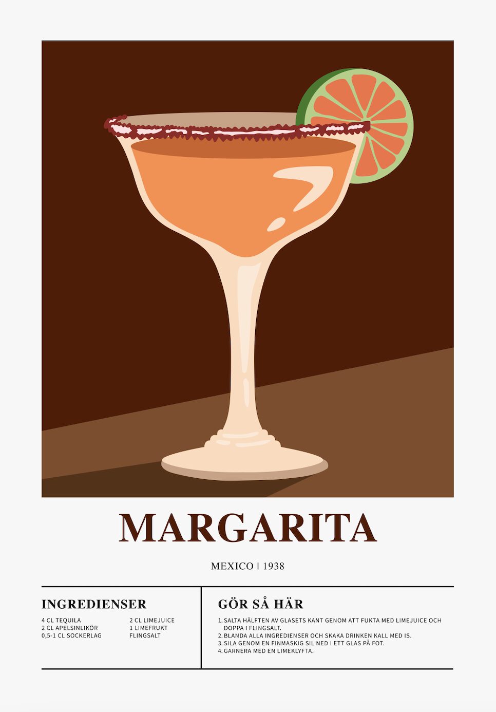 Mot en mörkbrun bakgrund, som ger associationer till en varm öken tronar ett klassiskt margaritaglas fyllt med en intensiv orangefärgad drink. Glaset är dekorerat med en skiva lime i kanten, där man tydligt ser både den gröna skalet och den gula frukten. Saltkanten på glaset är tydligt markerad, vilket ger en autentisk känsla. Glaset är tecknat med enkla, rena linjer och har en elegant form. Bakgrunden är minimalistisk, vilket låter fokus ligga på glaset och drinken. Bilden har en retrokänsla, som om den är hämtad från en gammal cocktailbok, men med en modern twist genom de starka färgerna och de grafiska elementen. Bilden utstrålar en känsla av sommar, fest och avkoppling. Den inbjuder till att njuta av en svalkande drink på en solig dag. De varma färgerna och de enkla formerna skapar en harmonisk och estetiskt tilltalande komposition. Texten ”Margarita” och ”Mexico 1938” förstärker den mexikanska och nostalgiska känslan.