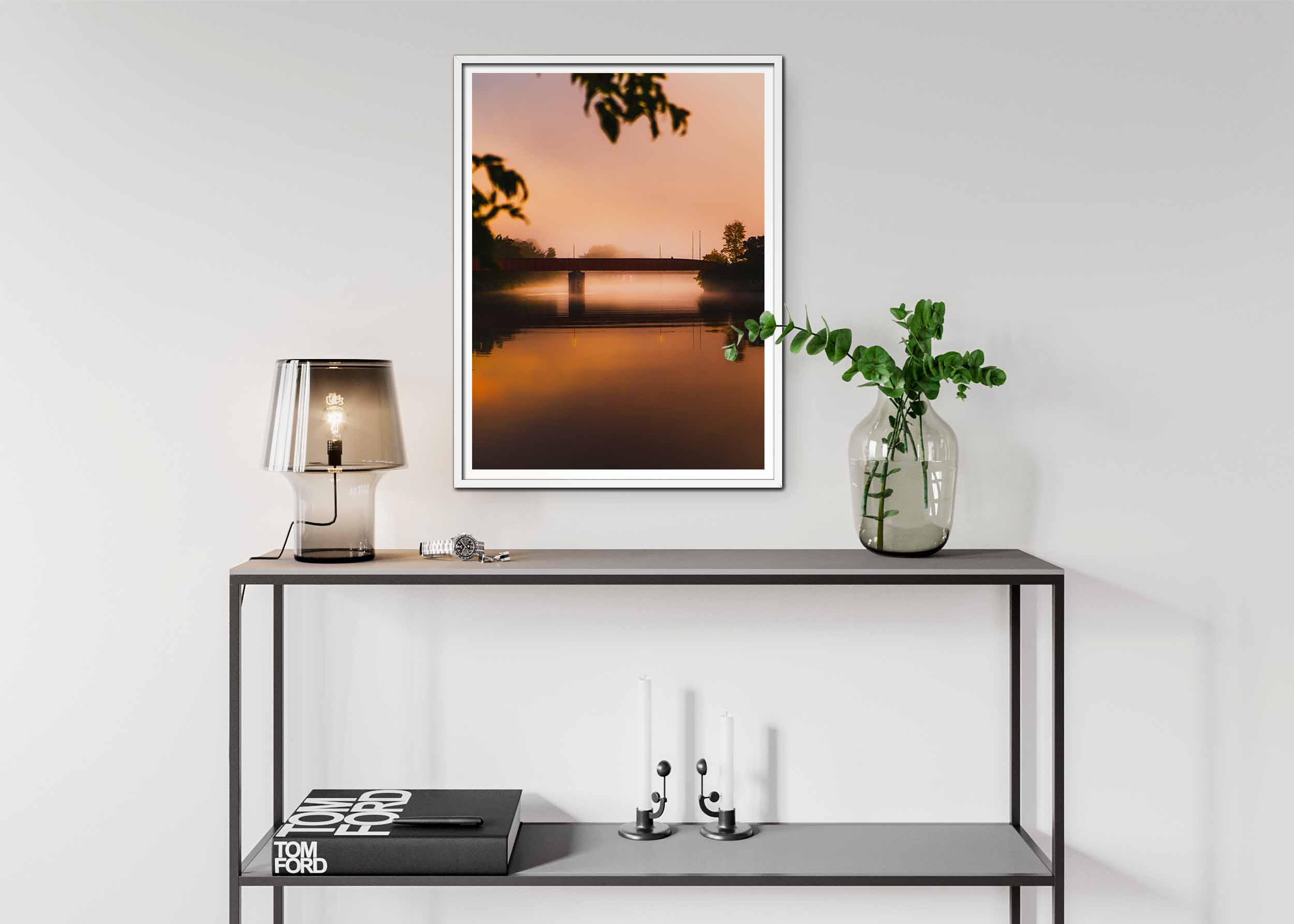 Denna bild, perfekt för en atmosfärisk poster, fångar en fridfull bro över Nissan i Halmstad, en dimmig morgon när solen just håller på att stiga över horisonten. Himmeln är mjukt orange och rosa, vilket skapar en varm ton som reflekteras i vattnet nedanför, där speglingarna flyter ut och ger en drömlik effekt. Dimmiga slöjor hänger tungt över vattenytan runt bron, vilket fördjupar mystiken i bilden.