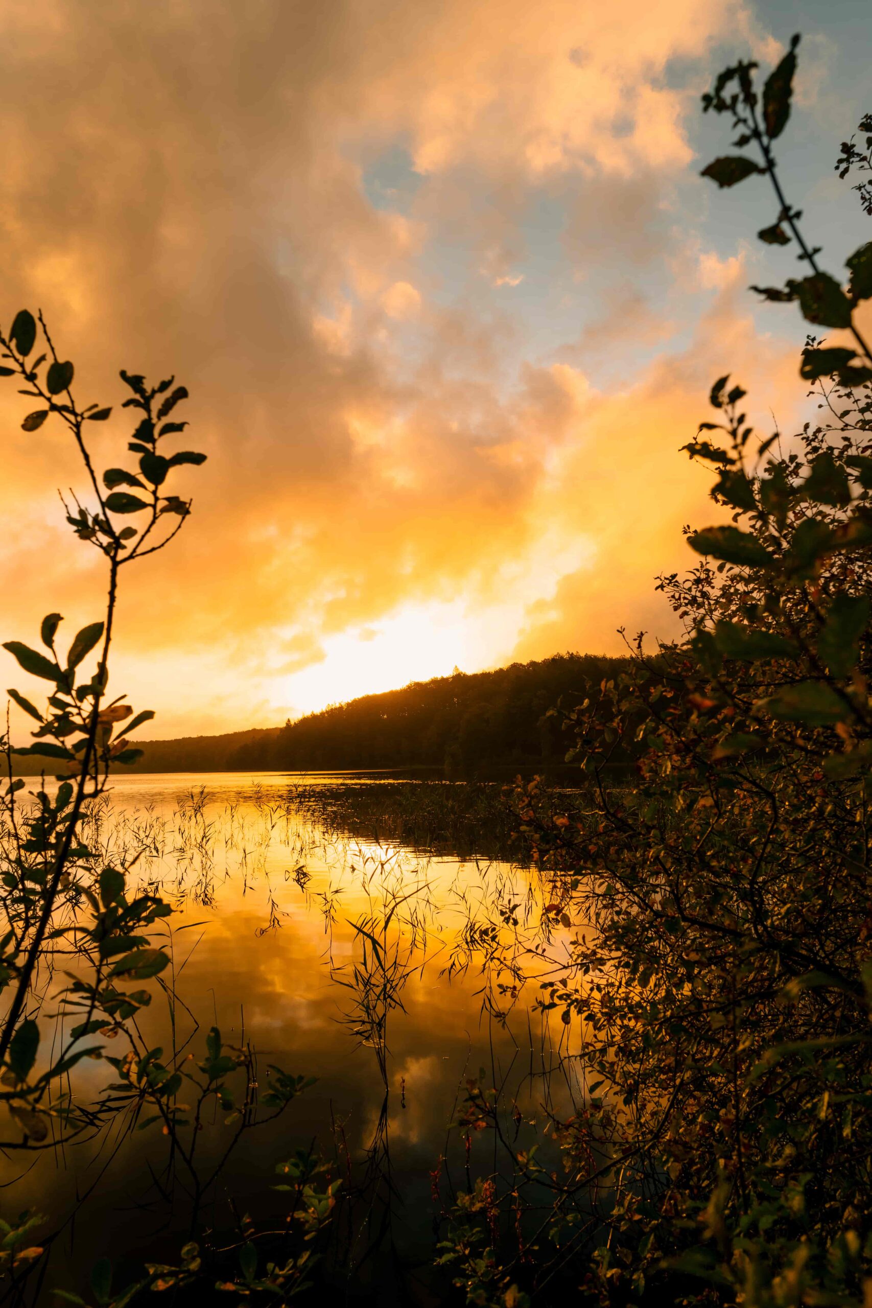 En lugn sjö med buskar i förgrunden och träd i bakgrunden. Himlen lyser dramatiskt med solens första strålar som lyser upp horisonten innan soluppgång.