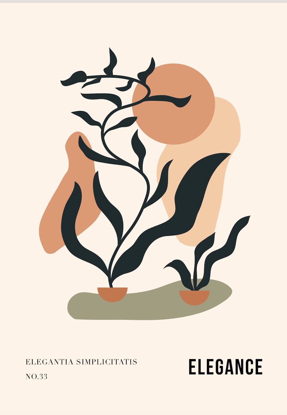 Bilden är en minimalistisk och stilren illustration som utstrålar elegans och harmoni. Mot en ljusbeige bakgrund finns två stiliserade växter i krukor. Växterna har stora, mörka blad och en organisk form som skapar en känsla av liv och rörelse. Bakom växterna finns abstrakta former i varma färger som orange och brunt, vilka skapar en känsla av djup och dimension.