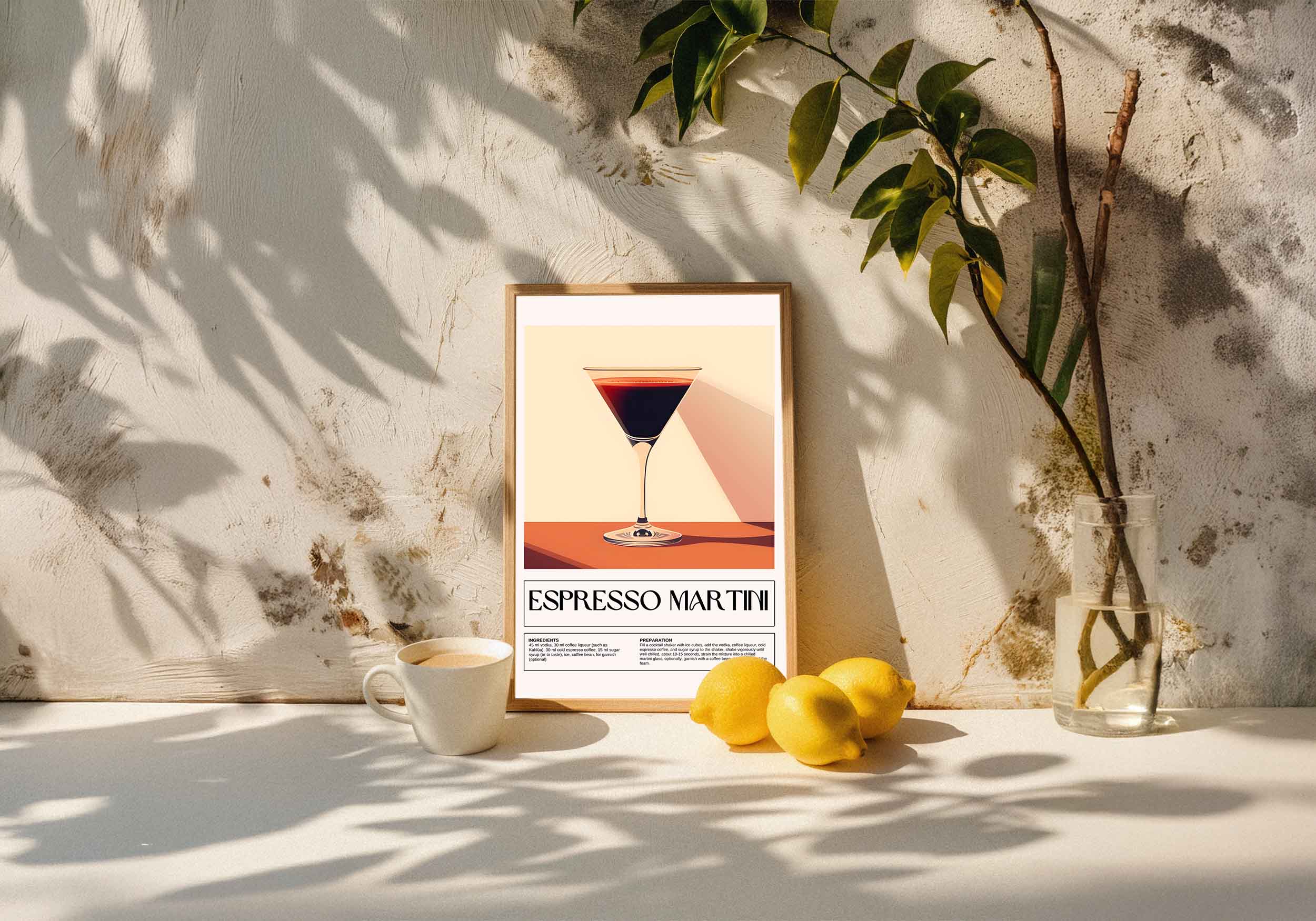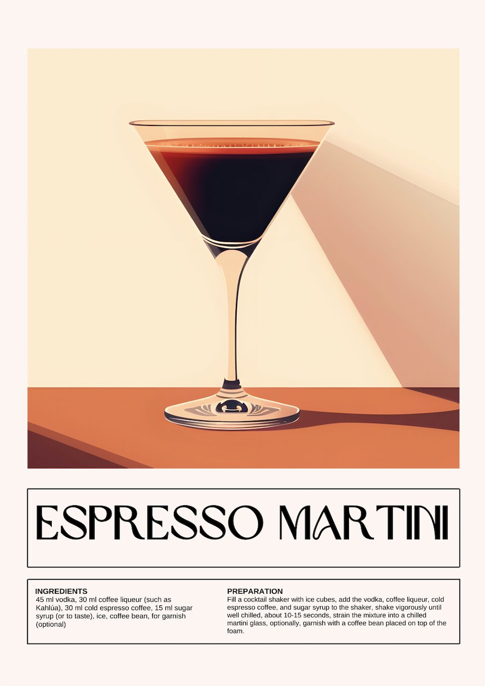 Under illustrationen finns tydlig text: ESPRESSO MARTINI, följt av receptet med ingredienser och tillagningsinstruktioner. Ingredienserna inkluderar vodka, kaffelikör, espresso och sockerlag, med möjlighet till garnering med en kaffeböna. Texten är stilrent uppdelad i två kolumner – en för ingredienser och en för förberedelse.