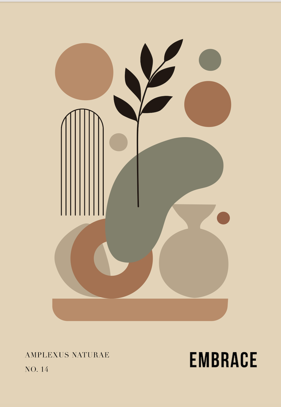 Poster som visar En minimalistisk illustration med en växt, en vas och abstrakta former i brunt, beige och grönt mot en ljusbeige bakgrund. Texten "Amplexus Naturae" och "Embrace" finns med.