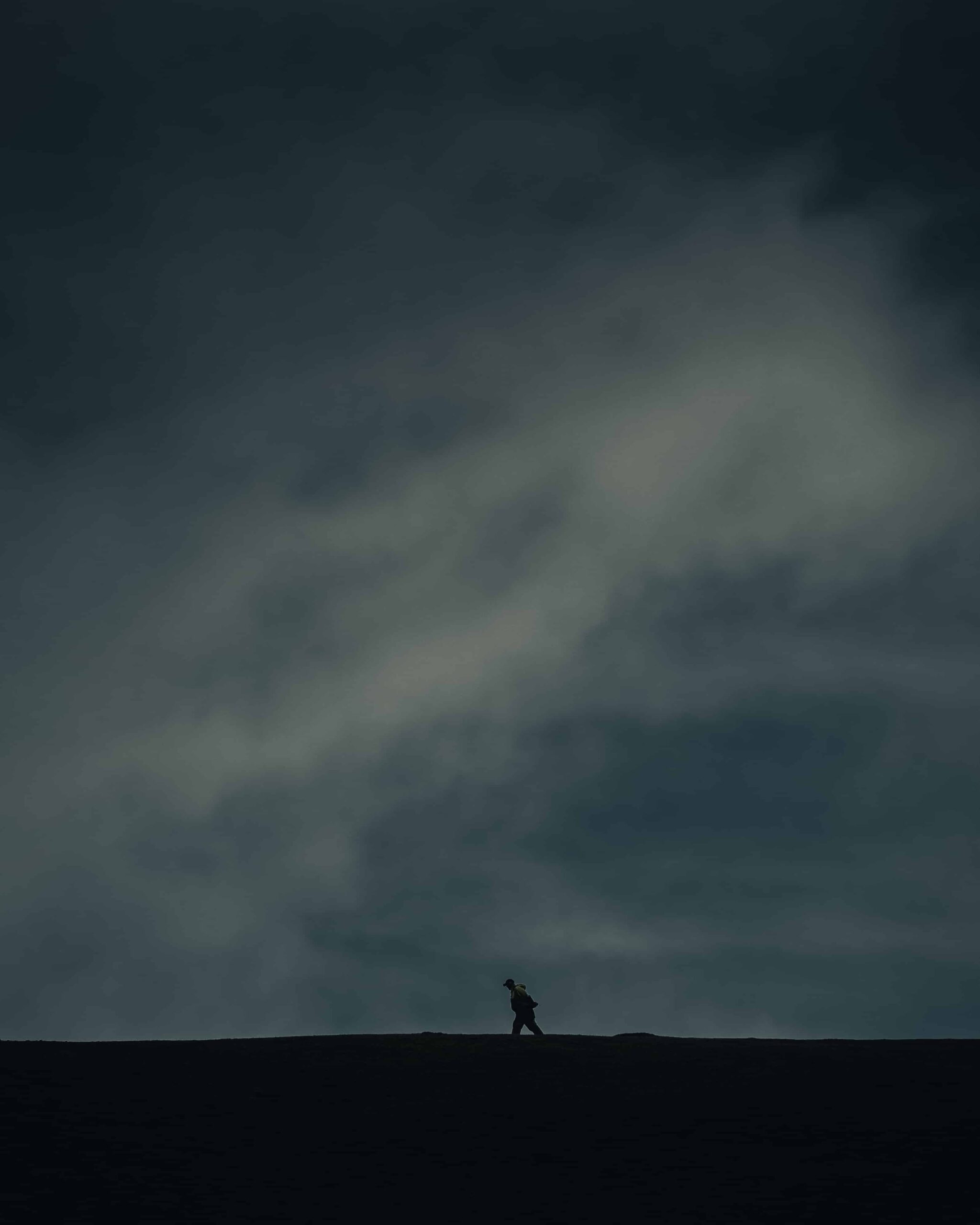 Denna bild visar en dramatisk och dyster landskapsvy som väcker känslor av ensamhet och introspektion. I förgrunden syns en ensam siluett av en person som vandrar längs en mörk, slät horisontlinje, vilket skapar en kraftfull kontrast mot den mörka himlen ovanför. Molnen är tjocka och hotfulla, med diffusa, ljusare partier som ger bilden en mystisk känsla. Himlens mörka färgtoner och den skarpa horisontlinjen förstärker intrycket av att individen står inför en överväldigande natur eller livets stora okändhet. Bildens enkelhet och tomhet ger den ett konstnärligt uttryck som passar för en atmosfärisk poster.