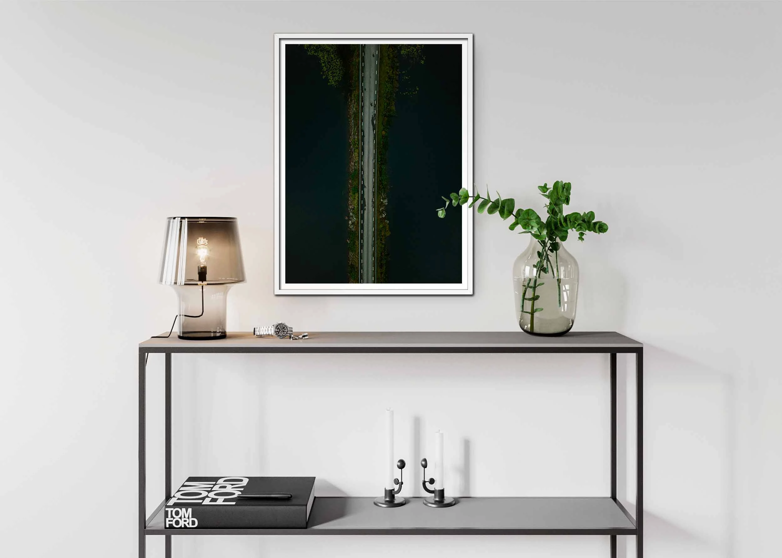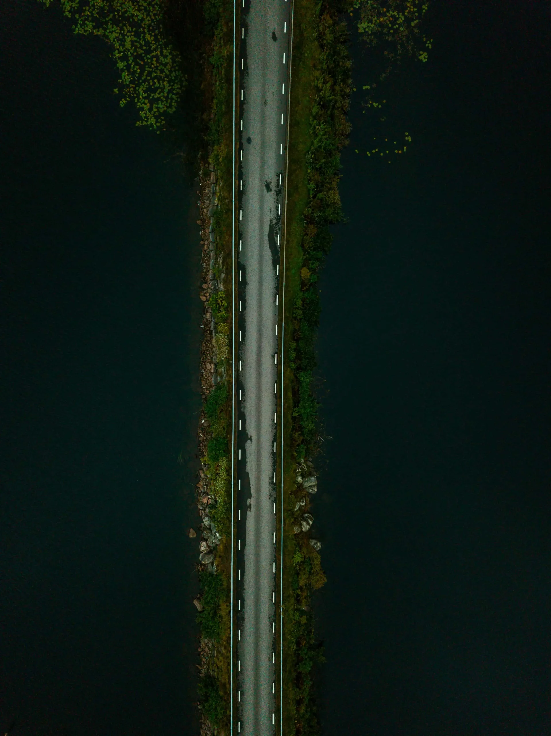 Denna poster visar en minimalistisk men kraftfull bild av en ensam väg som löper genom en spegelblank sjö, fångad ovanifrån med precision och detaljrikedom. Vägens grå asfalt, markerad med vita linjer, kontrasterar starkt mot sjöns mörka, djupa vatten, vilket skapar en nästan grafisk effekt. De tunna vägkanterna kantas av sten och växtlighet som inramar vägen och fördjupar bildens intensitet, där gröna nyanser bryter av mot det mörka vattnet och den grå vägen.