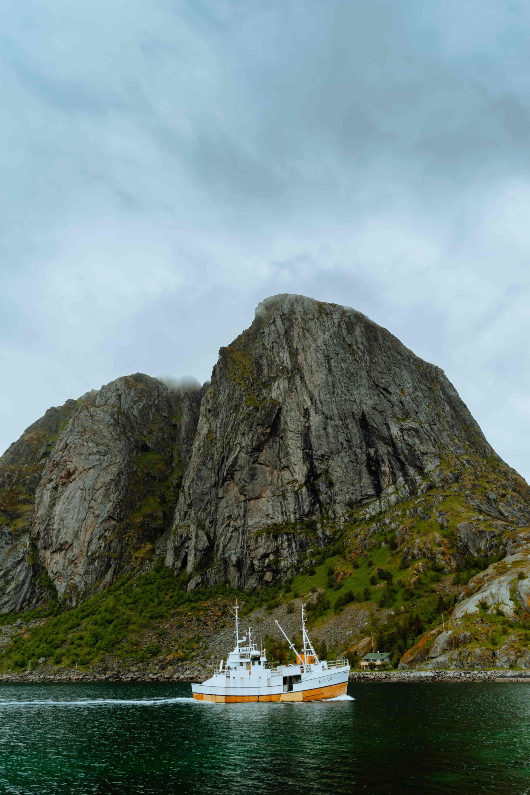 Ett fiskefartyg seglar mot ett stort, mörkt berg i Norge.