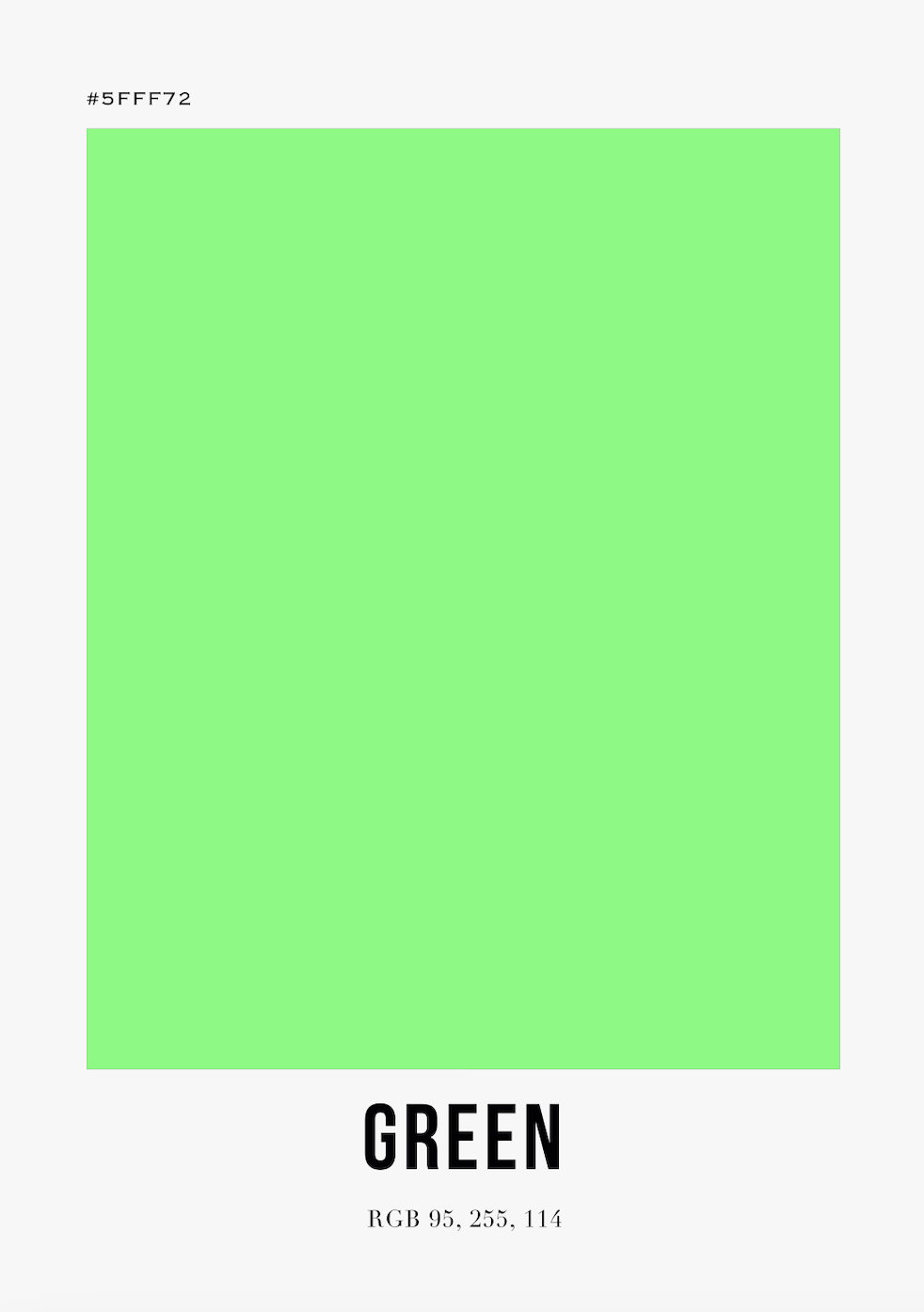 Bilden är en enkel, men effektfull representation av färgen grön. Den består av en stor, kvadratisk yta fylld med en intensiv grön färg, definierad av hex-koden #5FFF72. Den gröna färgen är ljus och livfull, och fyller hela bilden. Längst ned på bilden finns ordet ”GREEN” skrivet i svart, fet stil, tillsammans med RGB-värdena för färgen. Bakgrunden är helt vit, vilket skapar en skarp kontrast till den gröna färgen och gör den till bildens absoluta fokus.