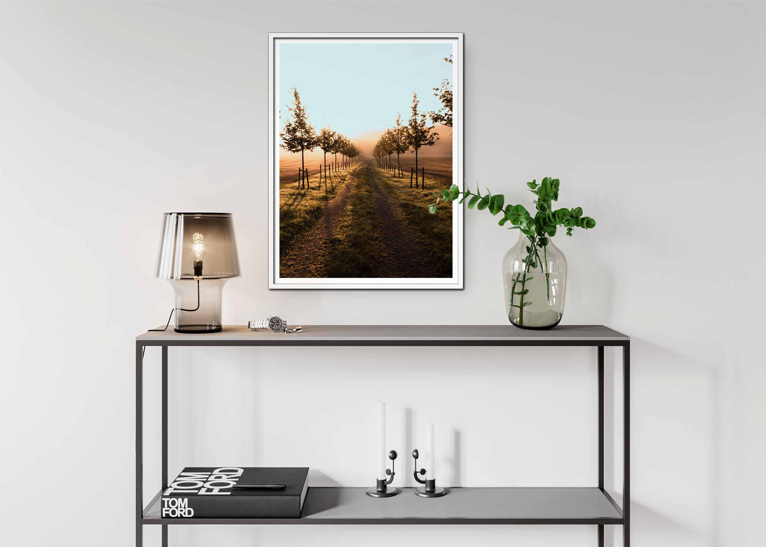 Bilden fångar en lång, rak grusväg som skär genom ett fält. Vägen är kantad av unga träd som står i perfekt led, deras skuggor faller långa och skarpa på det gröna gräset. Morgonsolen färgar himlen i varma, gyllene toner och kastar ett mjukt ljus över landskapet. Dimma ligger lätt över fältet, vilket skapar en drömlik och mystisk atmosfär. I fjärran försvinner vägen in i dimman, vilket ger bilden en känsla av oändlighet och möjlighet.