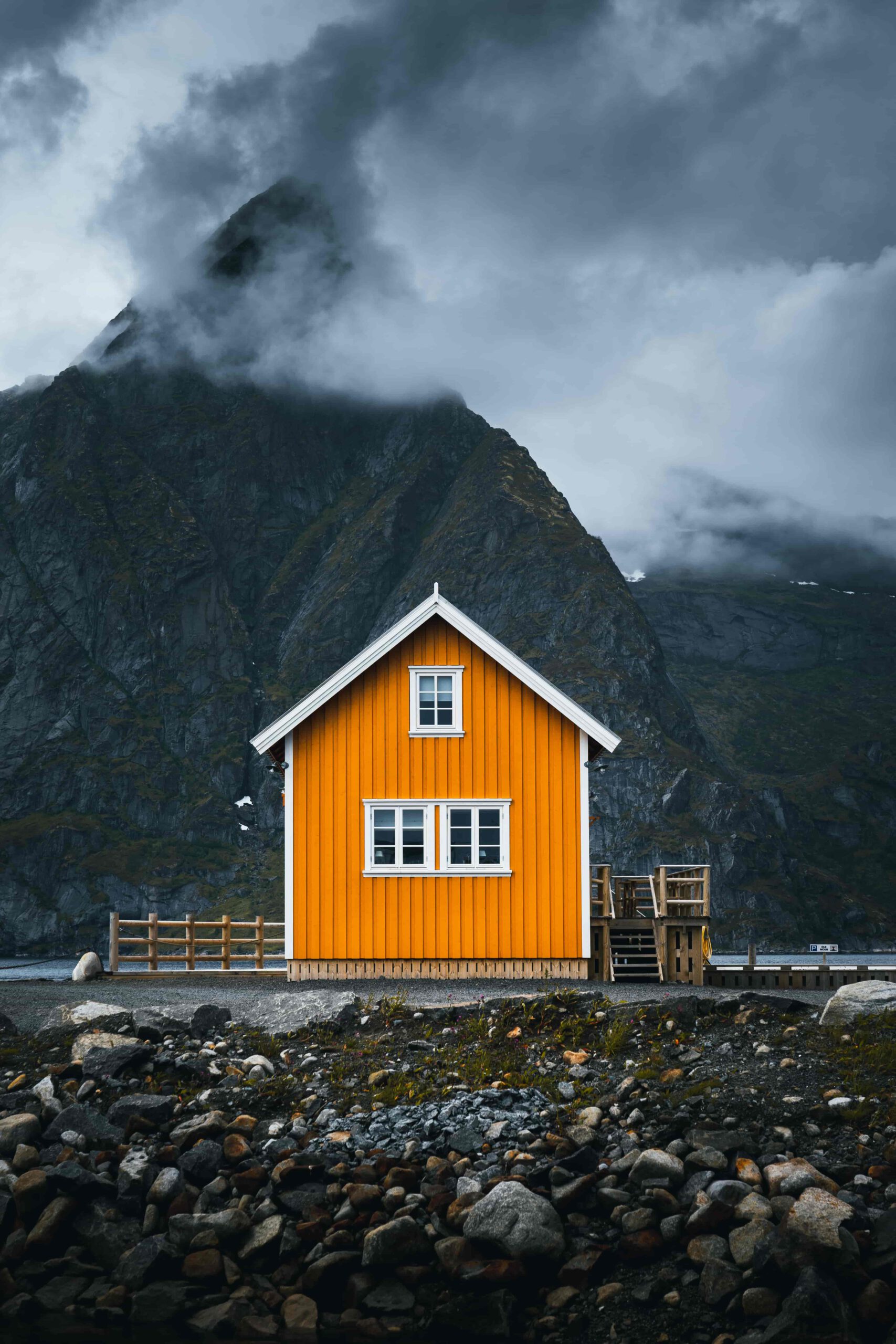 Bilden fångar ett ögonblick av stillhet och enkelhet i det norska landskapet. I förgrunden står ett litet, gult hus med vita knutar. Det färgglada huset sticker ut mot den mörka, steniga stranden och de mörka bergen i bakgrunden. Bergen är täckta av ett tjockt molntäcke som ger en känsla av mystik och dramatik. Huset har små, fyrkantiga fönster och en enkel dörr. Det finns en liten veranda med en träräcke framför huset, och en liten brygga sträcker sig ut i vattnet. Bilden ger en känsla av lugn och ro, och inbjuder betraktaren att föreställa sig livet i denna avskilda plats.
