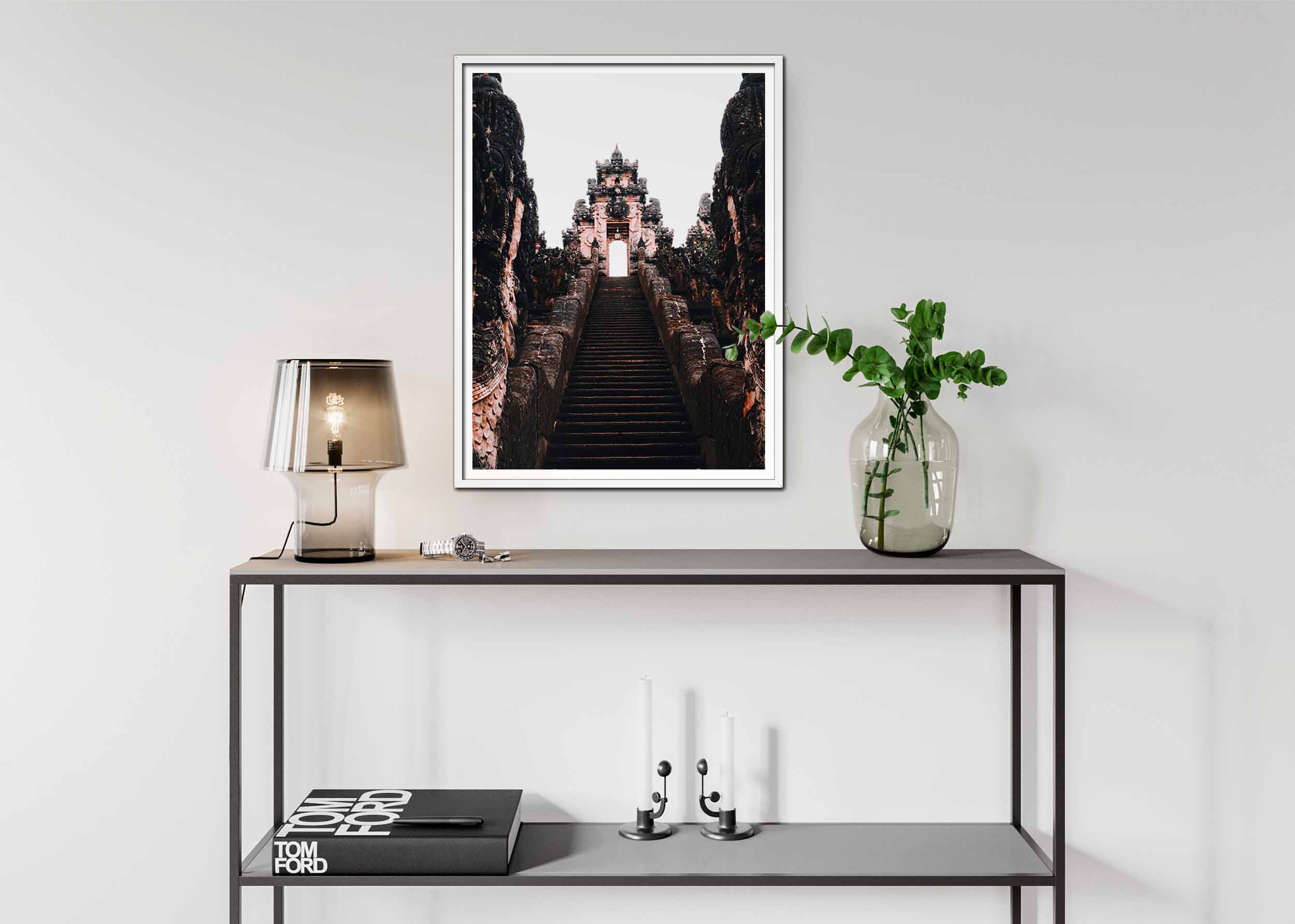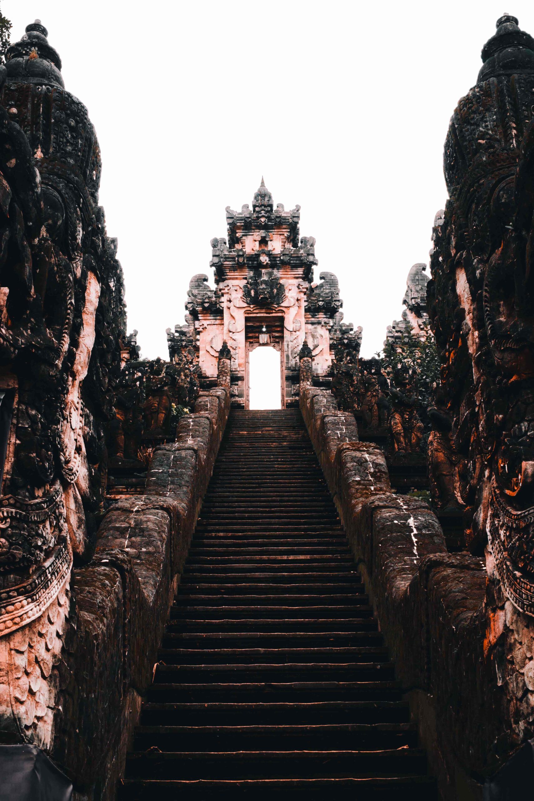 Bilden visar en imponerande stentrappa som leder upp till en detaljrik tempelport. Trappan är bred och består av många steg som verkar sträcka sig mot himlen. På vardera sida av trappan står två ståtliga statyer med djuriska drag, vilket skapar en känsla av både välkomnande och vördnad. Tempelporten är prydd med intrikata sniderier och har en mörk, nästan mystisk öppning. Bakgrunden är ljus och oskarp, vilket gör att fokus ligger på trappan och templet. Bilden ger en känsla av både lugn och äventyr, och inbjuder betraktaren att ta steget upp och utforska det okända.