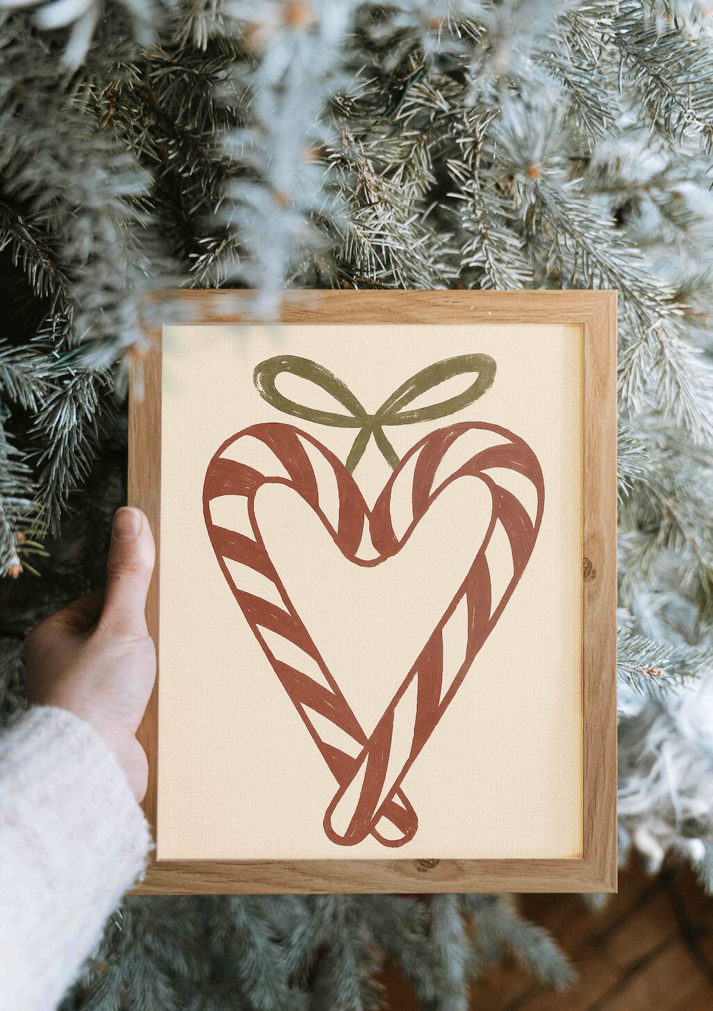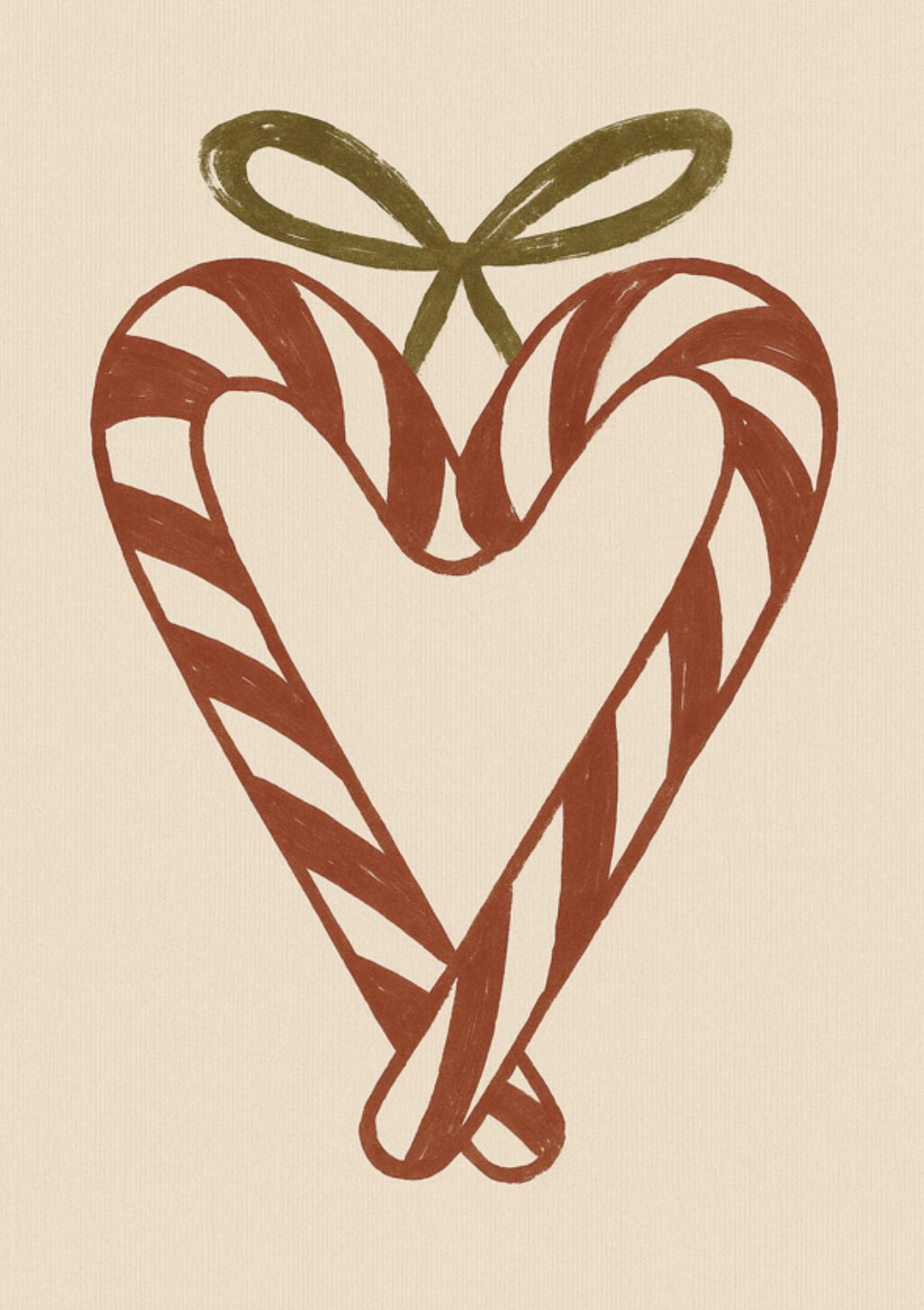 Två polkagriskäppar, handmålade i varma rödvita penseldrag, möts och bildar ett elegant hjärta. Ovanför knyter en olivgrön rosett ihop kompositionen och ger motivet en mjuk, nostalgisk ton. Den ljusa, pappriga bakgrunden låter de levande penselspåren och de ojämna färgskiftningarna i akvarellen komma till sin rätt. Postern förmedlar både julstämning och kärlek – perfekt att hänga i hallen som välkomsthälsning, i köket för en söt touch eller i vardagsrummet tillsammans med övrig juldekor.