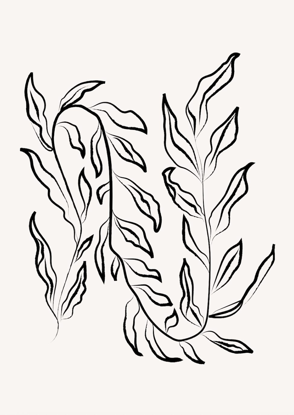 Denna poster har en stilren och modern design där botaniska former möter minimalistisk linjekonst. Motivet består av två grenar med eleganta blad, målade i svarta penseldrag som skiftar mellan tunna och kraftfulla linjer. Bladen är detaljrikt återgivna men samtidigt förenklade, vilket ger en konstnärlig balans mellan naturens komplexitet och enkelhetens skönhet.