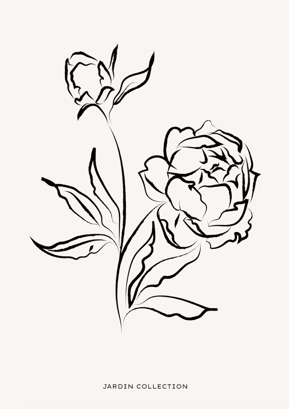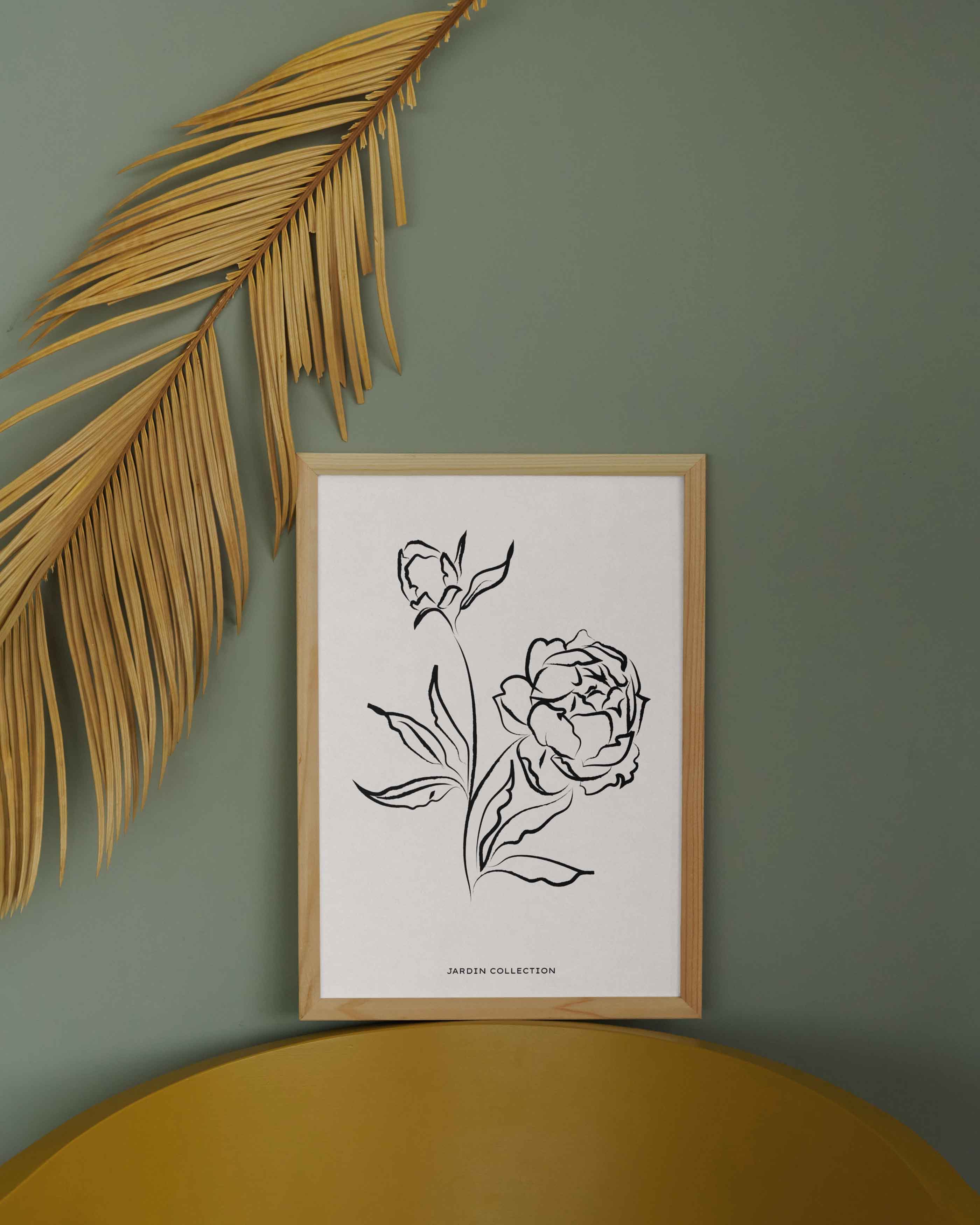 Denna eleganta poster från Jardin Collection visar ett konstnärligt motiv av pioner i minimalistisk linjekonst. Bilden är skapad med svarta, dynamiska penseldrag som fångar blommornas naturliga former på ett stiliserat och sofistikerat sätt. På bilden syns en pion i full blom samt en knopp, vilket skapar en känsla av livscykel, tillväxt och förnyelse.