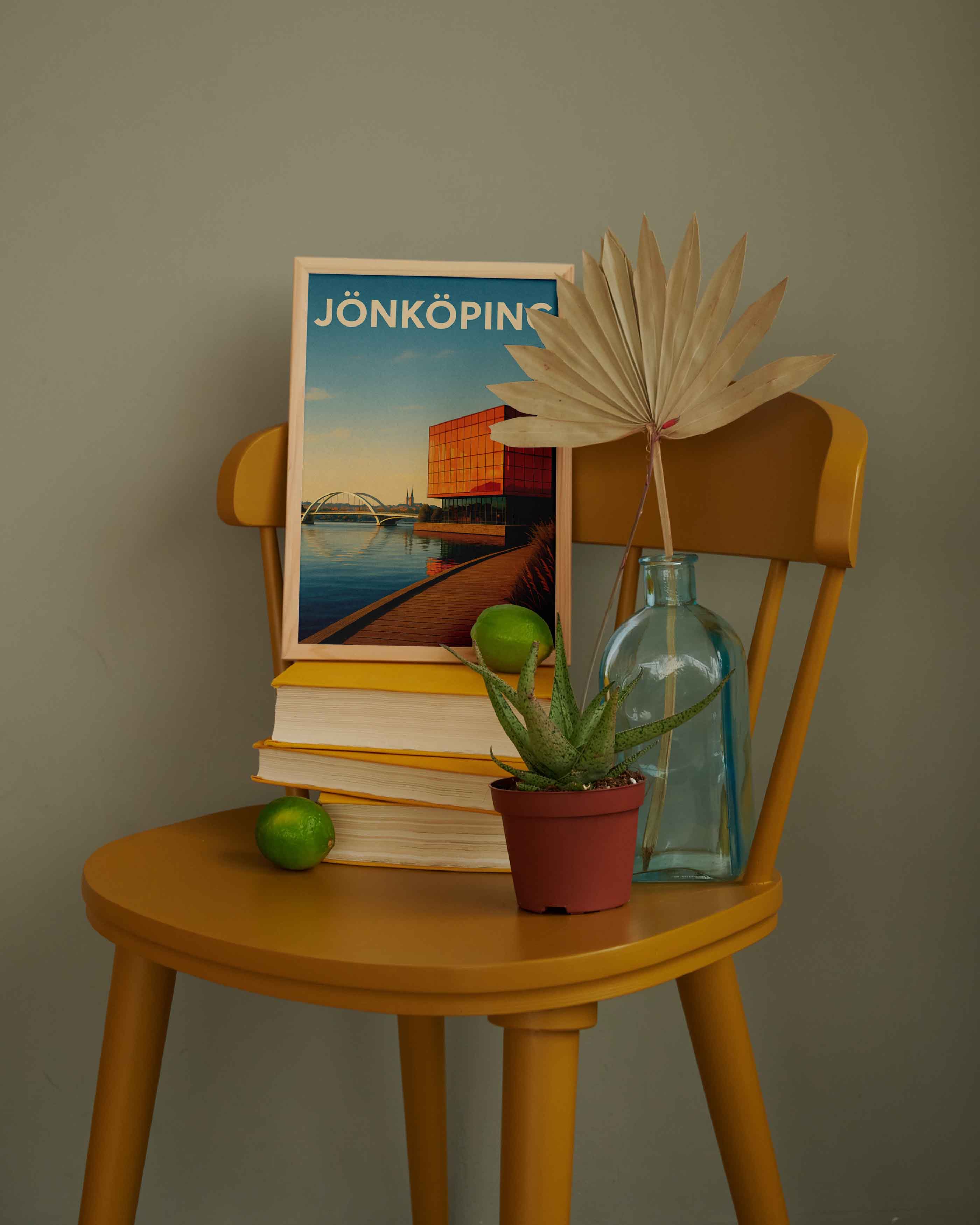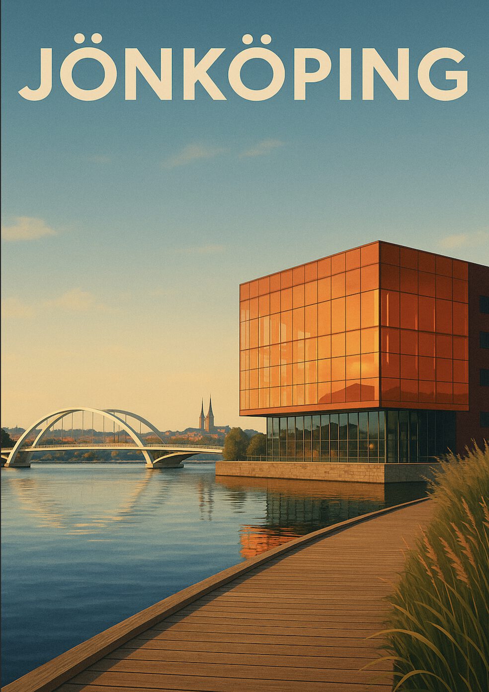Denna affisch föreställer Jönköping, vackert fångad i en stiliserad retroinspirerad design. I förgrunden syns det moderna, ikoniska glashuset vid Munksjön, med sina reflektioner i det stilla vattnet. Byggnaden har en intensiv orange ton som kontrasterar fint mot den blå himlen och sjöns spegelblanka yta. Till vänster syns den välkända vita gångbron som elegant sträcker sig över vattnet, och längre bort skymtar Jönköpings kyrktorn mot horisonten. Affischen kombinerar modern arkitektur med klassiska stadsvyer och fångar den unika atmosfären i Jönköping. Perfekt för den som vill pryda sitt hem med en tidlös hyllning till staden. Postern passar särskilt bra i vardagsrummet, hallen eller hemmakontoret där den kan ge en känsla av stadspuls och skandinavisk estetik.