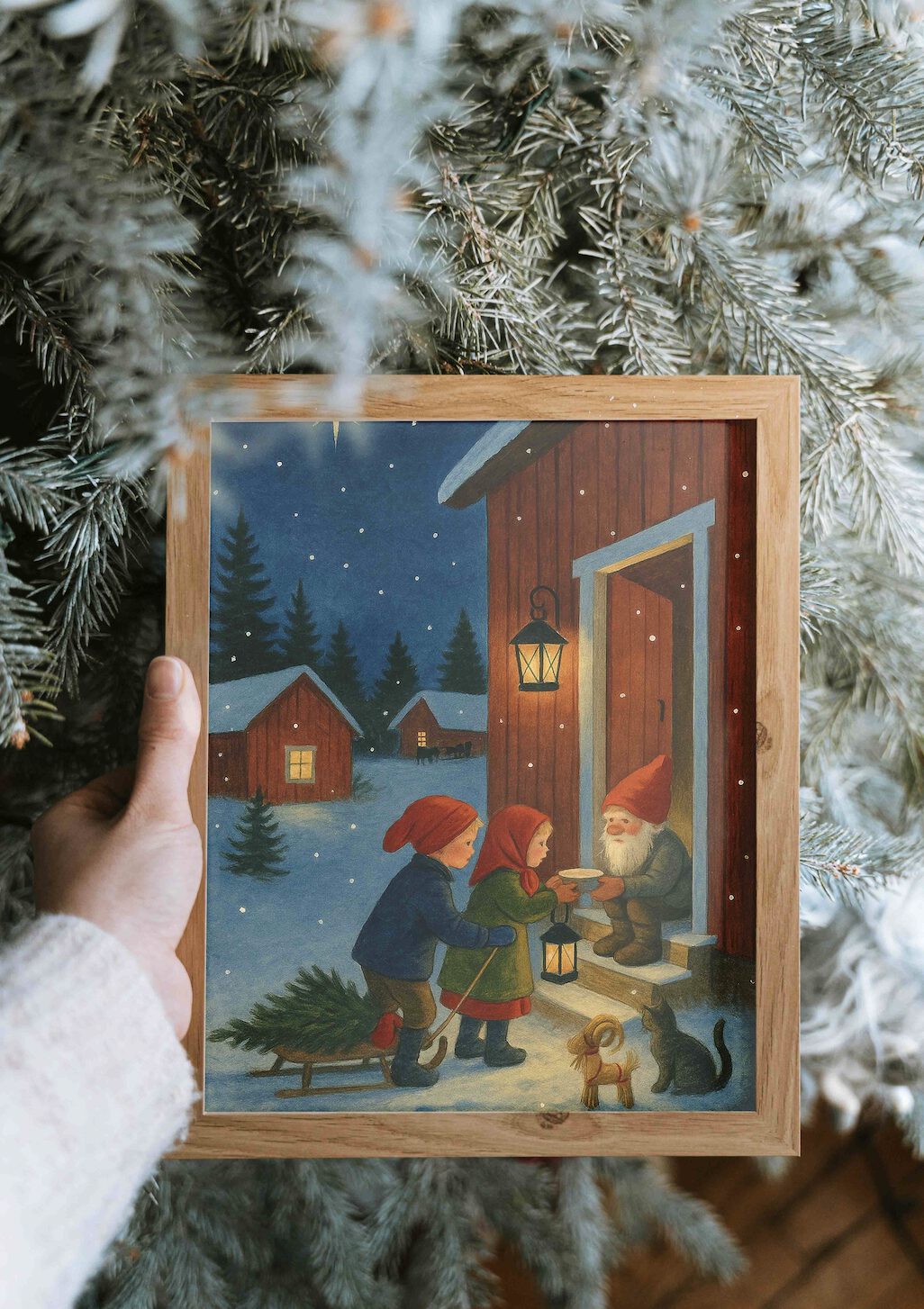 En sagolik vinterkväll breder ut sig över ett snötäckt torplandskap. Under en klar stjärnhimmel – där en stor julstjärna lyser extra varmt – skymtar röda timmerstugor med snötäckta tak och gula fönsterljus. I förgrunden kliver två barn uppför farstutrappan: flickan i grön kappa och röd sjal bär en liten lykta och räcker en skål gröt till gårdstomten, som sitter på trappsteget med rosiga kinder, vit skäggtofs och röd luva. Bredvid henne står en julbock av halm, och en nyfiken katt i snön följer scenen. Pojken, i mörkblå jacka och röda luvan, håller i snöret till en kälke lastad med en nyhuggen gran. Ljuslyktan vid dörren kastar ett gyllene sken mot husväggen och skapar mjuka skuggor i snöfallet. Postern fångar nordisk folktradition, stilla förväntan och julfrid i ett och samma ögonblick. Passar vackert i vardagsrum, hall eller barnrum för att sprida varm, nostalgisk julstämning.