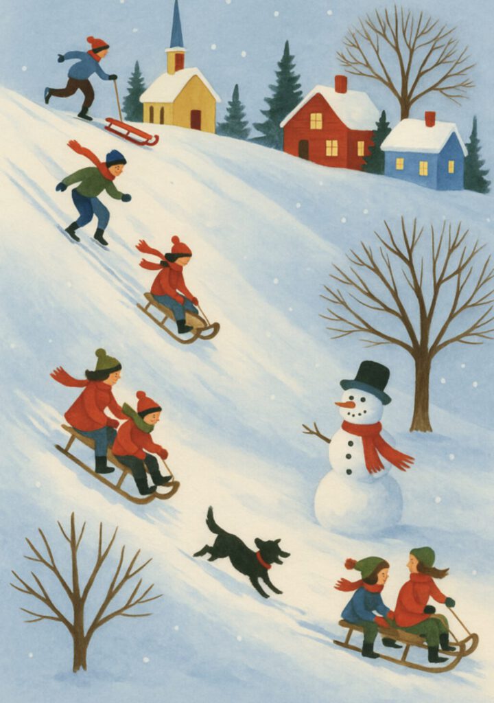 En klar vinterdag susar barn nerför en lång, mjuk kälkbacke. Röda halsdukar fladdrar i fartvinden, medan en svart hund skuttar lyckligt mellan slädarna. Längre upp drar ett barn sin kälke mot nästa åk; nedanför vinkar en snögubbe med hög hatt och morotsnäsa. Bakom backen ligger en liten by: röda och blå stugor med gula fönsterljus, mörkgrön granridå och en liten kyrka med spira som sticker upp mot snöflingornas ljusa himmel. Illustrationen fångar vinterns lekfulla energi i mjuka akvarelltoner – perfekt som stämningshöjare i vardagsrum, barnrum eller hall.