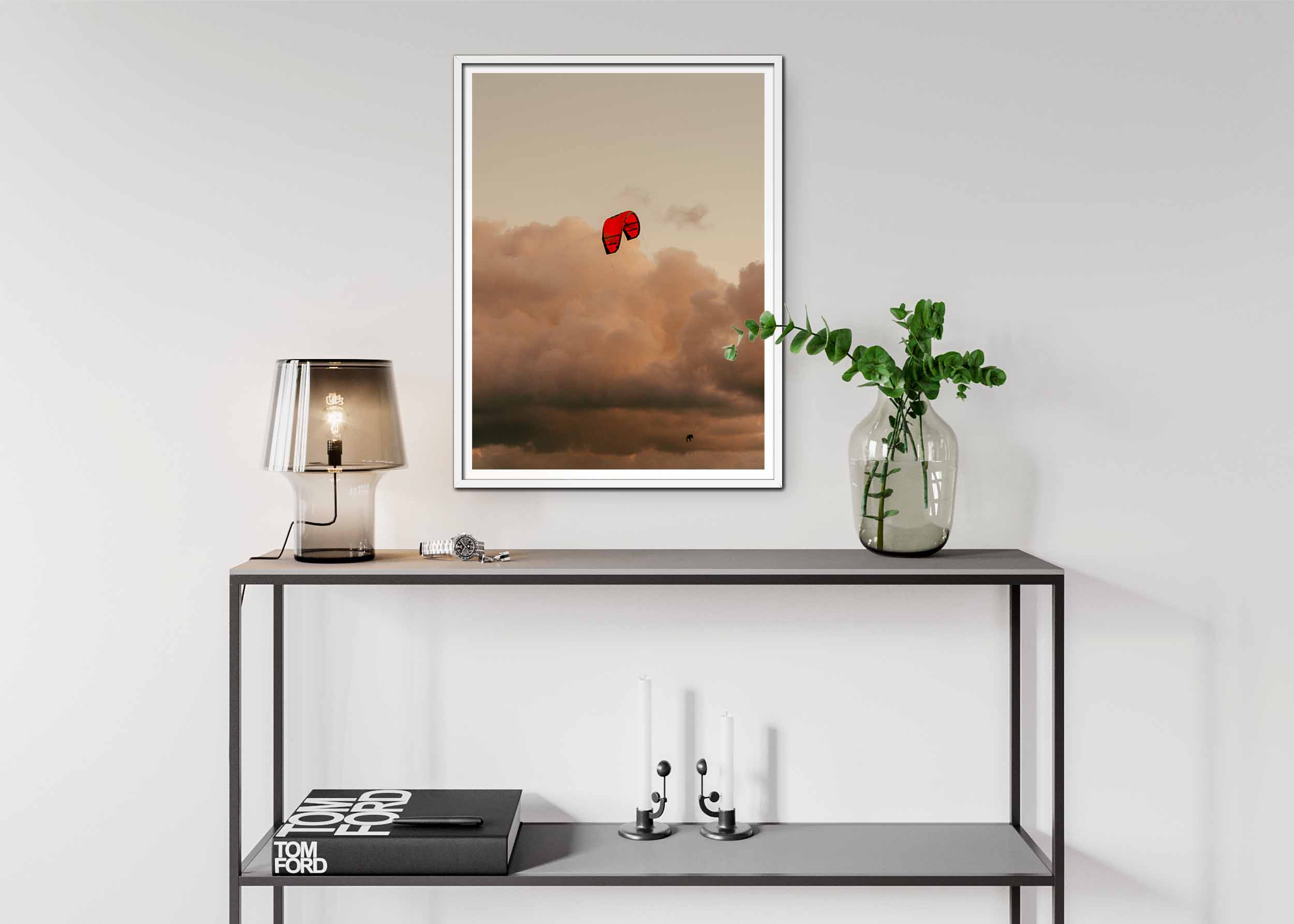 Kiten är den enda synliga delen av sporten, och avsaknaden av människor gör att bilden känns ren och fokuserad, som en hyllning till kitesurfingens enkelhet och elegans. Denna poster bjuder in betraktaren att drömma om frihet, vindens kraft och naturens skönhet i solnedgångens sista, gyllene ögonblick.