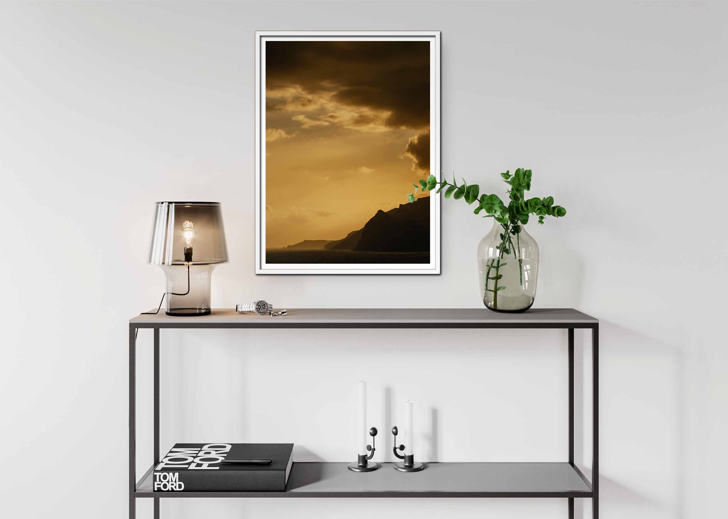 Bilden fångar en dramatisk och stämningsfull vy av en kust vid solnedgång. Himlen är dominerad av mörka, dramatiska moln som skapar en stark kontrast mot den varma, gyllene färgen som lyser upp horisonten. Solens strålar bryter igenom molnen och kastar ett varmt sken över landskapet. I förgrunden reser sig en dramatisk klippformation, dess skarpa siluett skärs ut mot den färgglada himlen. Klipporna verkar sträcka sig långt ut i havet, och deras råa skönhet förstärks av det lugna, mörka vattnet nedanför. Bilden ger en känsla av både vildhet och skönhet, och inbjuder betraktaren att drömma sig bort till en avlägsen och mystisk plats.
