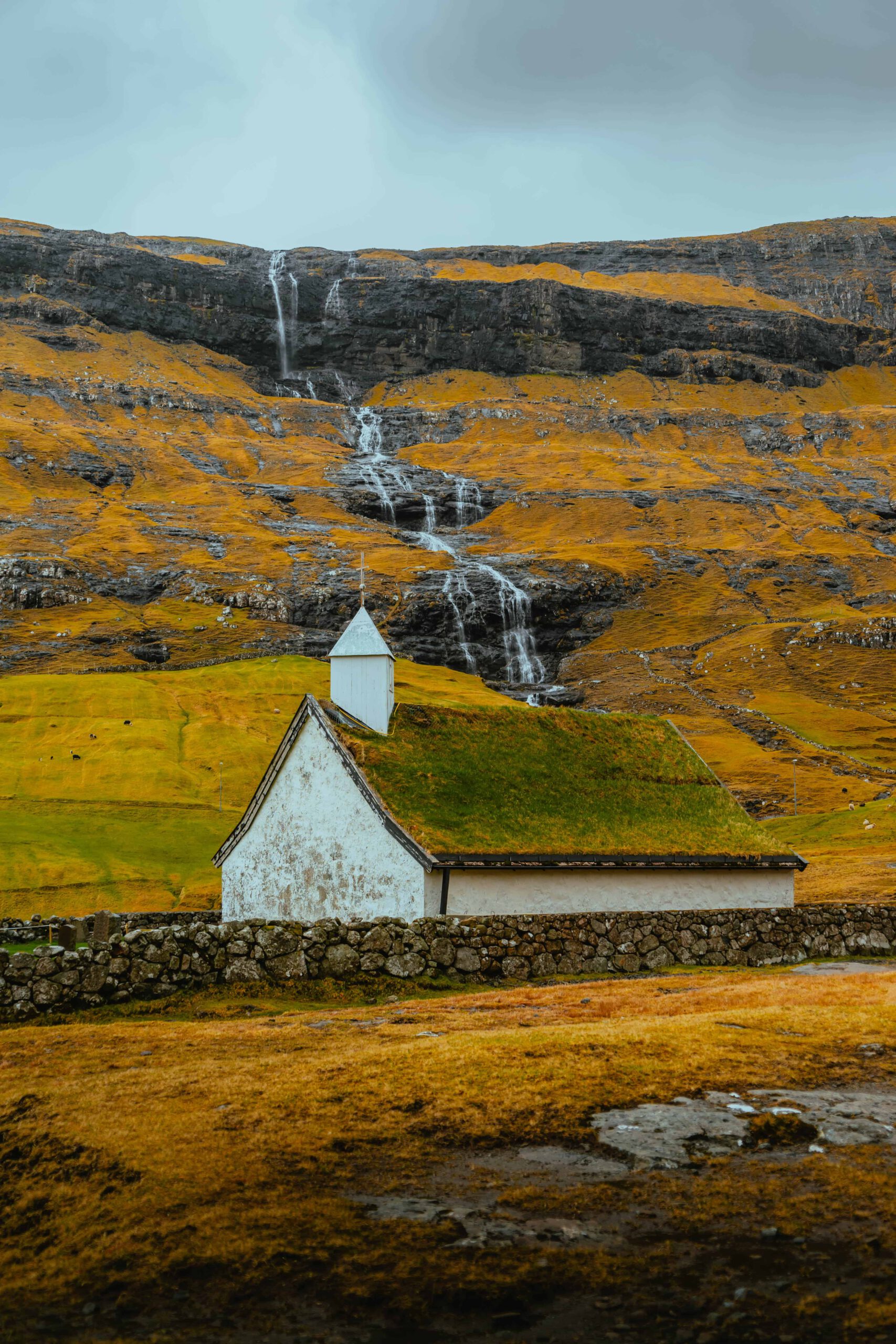 En liten, vit kyrka med grästak ligger på en grön kulle vid ett vattenfall på Färöarna.