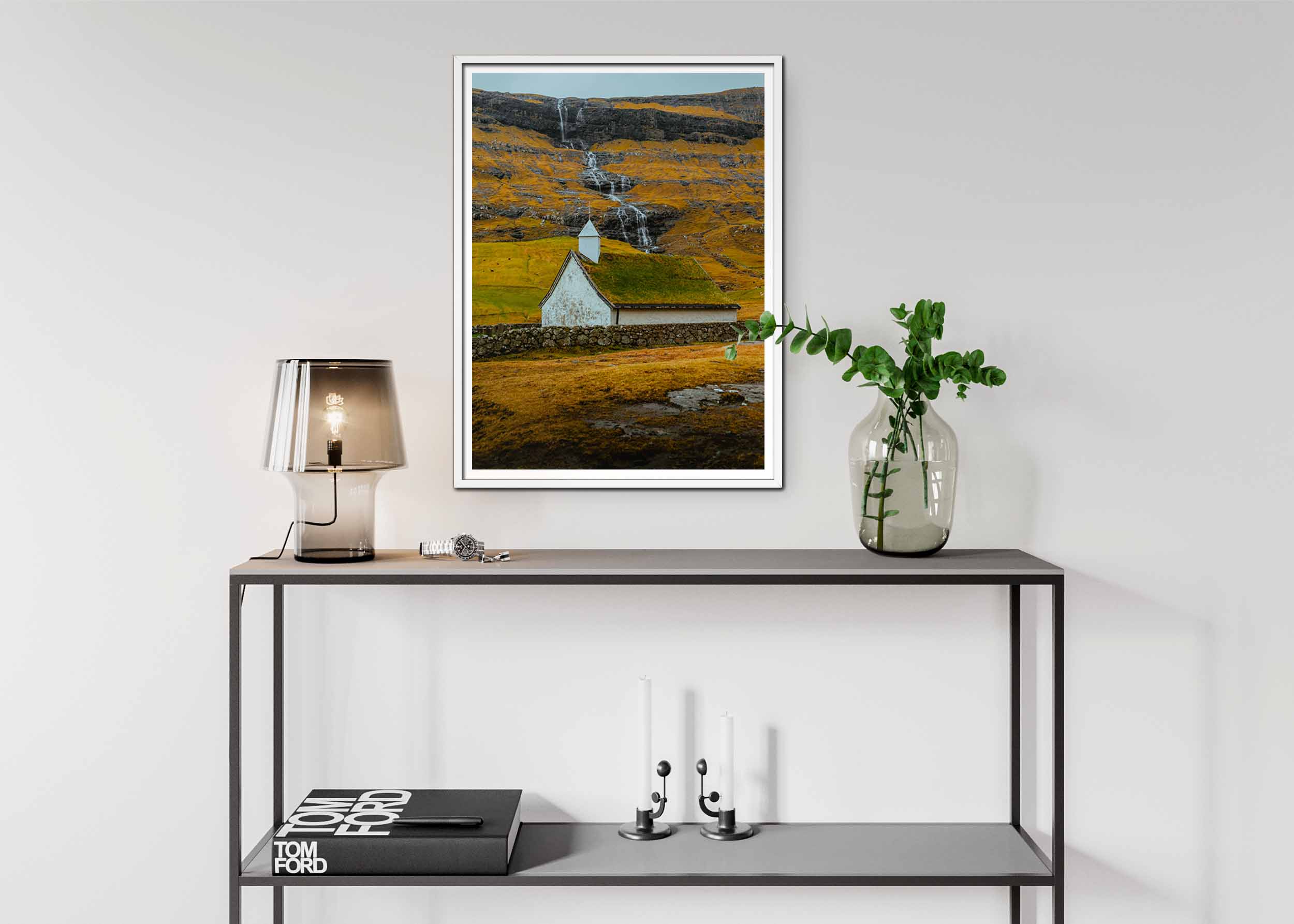 Bilden fångar en idyllisk och nästan overklig scen från ett avlägset landskap. I förgrunden står en liten, vit kyrka med ett grästak. Kyrkan är omgiven av ett lågt stengärde och ligger på en grön kulle som slutar i en brant klippa. Bakom kyrkan faller ett vattenfall nerför klippsidan, vilket skapar en dramatisk kontrast till den lugna och fridfulla atmosfären runt kyrkan. Himlen är grå och molnig, vilket ger bilden en mystisk och nästan drömlik känsla. Det gröna gräset och de mörka klipporna skapar en stark kontrast och ger bilden en känsla av både skönhet och vildhet.