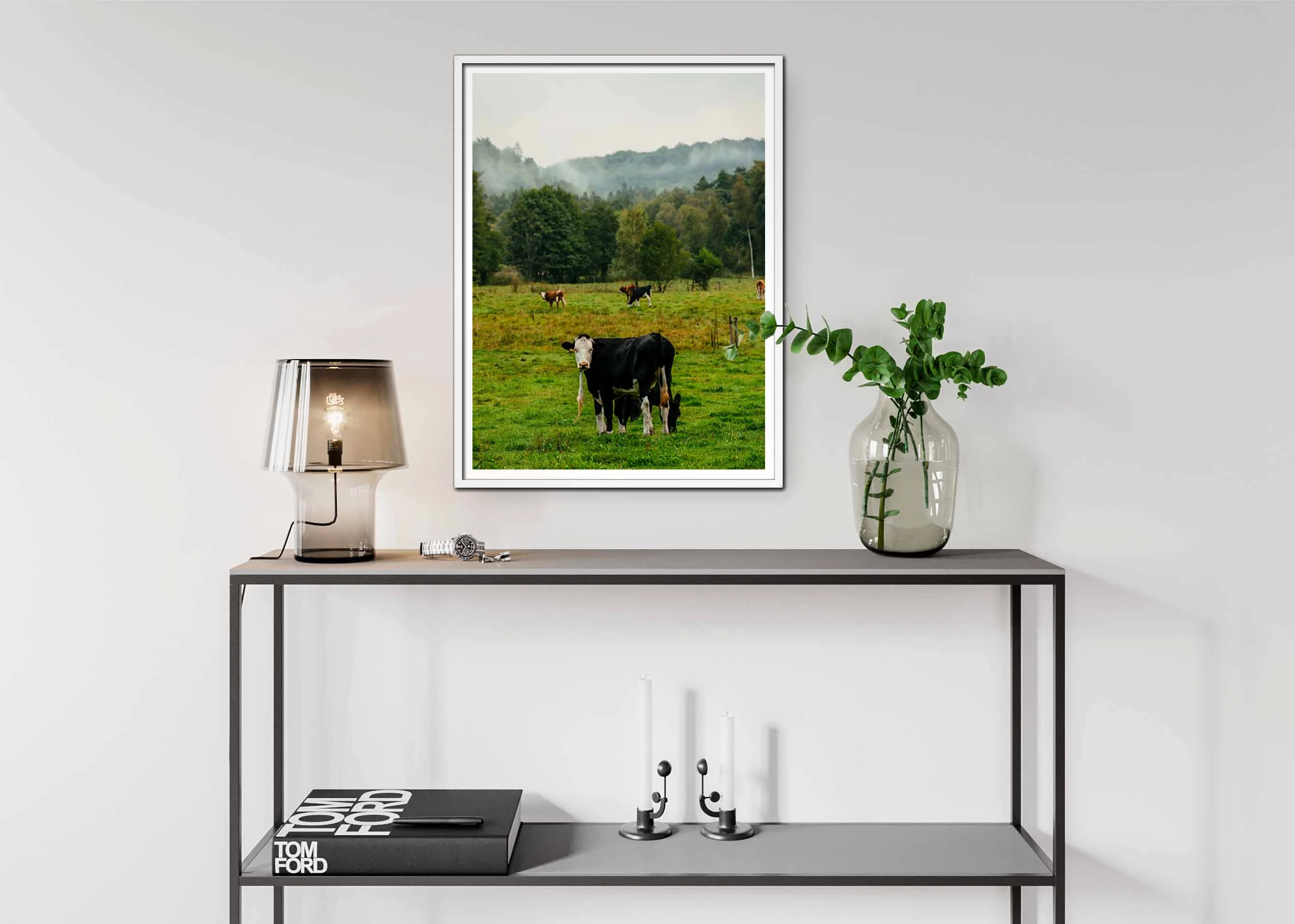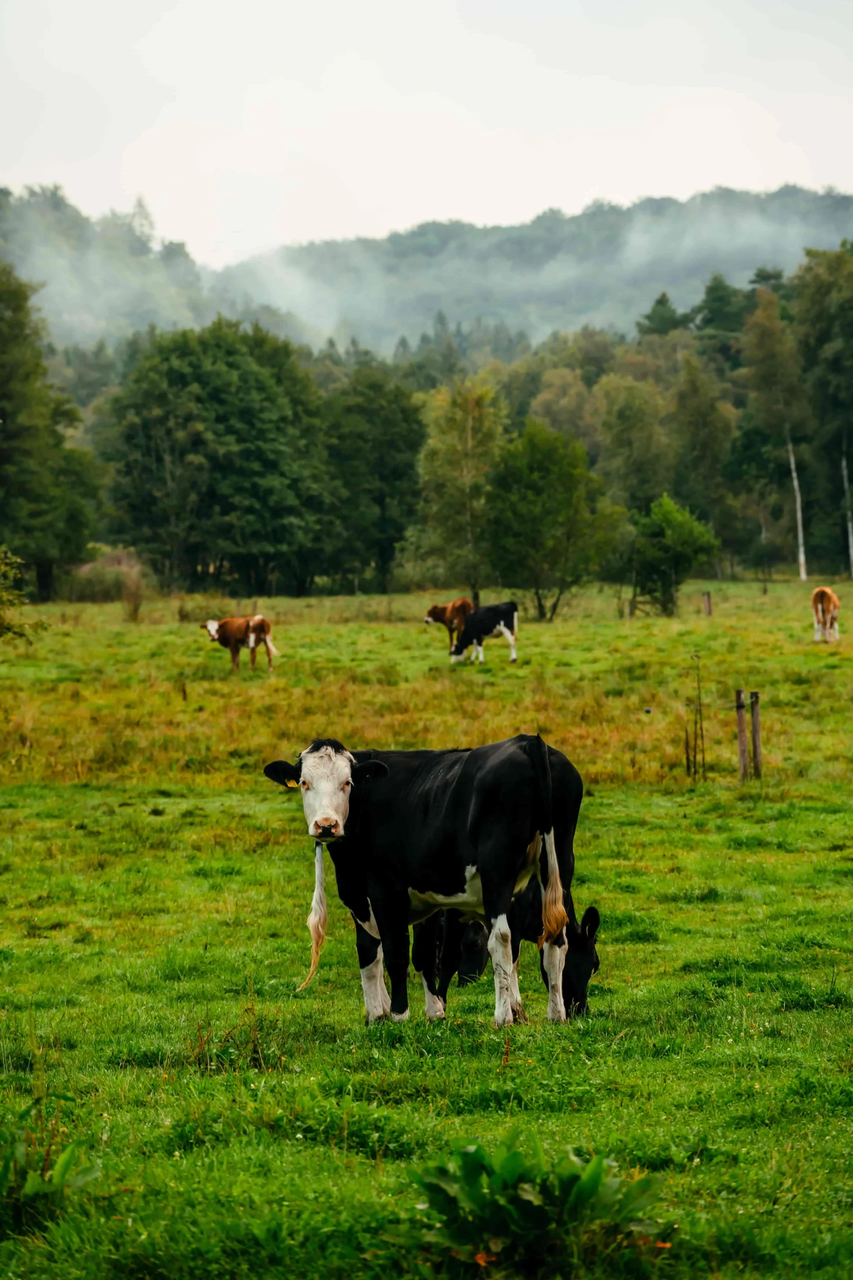 Ett lugnt lantligt landskap breder ut sig med betande kor i förgrunden. En svartvit ko står centralt och tittar direkt in i kameran med en lugn, nyfiken blick, vilket ger bilden en känsla av närvaro och autenticitet. I bakgrunden syns flera andra kor som sprider ut sig över den frodigt gröna ängen, omgivna av naturlig växtlighet. Dimman som sveper in över skogsbrynet längre bort ger ett drömlikt, nästan mystiskt skimmer åt scenen, medan de täta träden i olika nyanser av grönt skapar en rik och fyllig bakgrund. Den milda, grå himlen bidrar till en harmonisk färgpalett som framhäver kontrasterna mellan de gröna markerna, trädens dova toner och korna som strövar fritt. Bilden förmedlar en lugn och harmonisk atmosfär, perfekt för att fånga det svenska landsbygdens stillhet och skönhet.