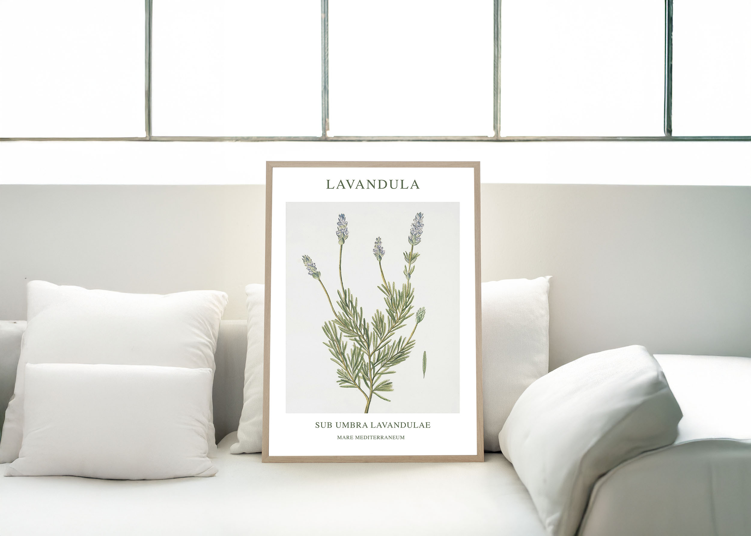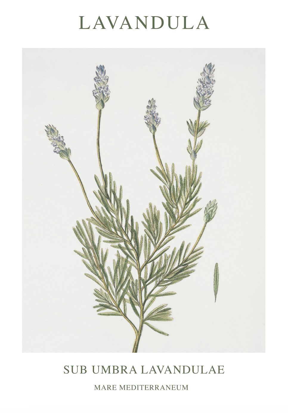 Mot en ljus, nästan vit bakgrund sträcker sig en kvist av lavendel. De smala, grågröna bladen är tätt packade längs stjälken. Uppemot grenarna sitter flera lavendelblå blomspiror, var och en med små, rörformade blommor. Blommorna är vända mot betraktaren och avslöjar sin delikata struktur. Ljuset faller mjukt över blommorna och bladen, vilket ger bilden en lugn och harmonisk känsla. Bilden har en klassisk och botanisk stil, som om den är hämtad ur en gammal herbarium.