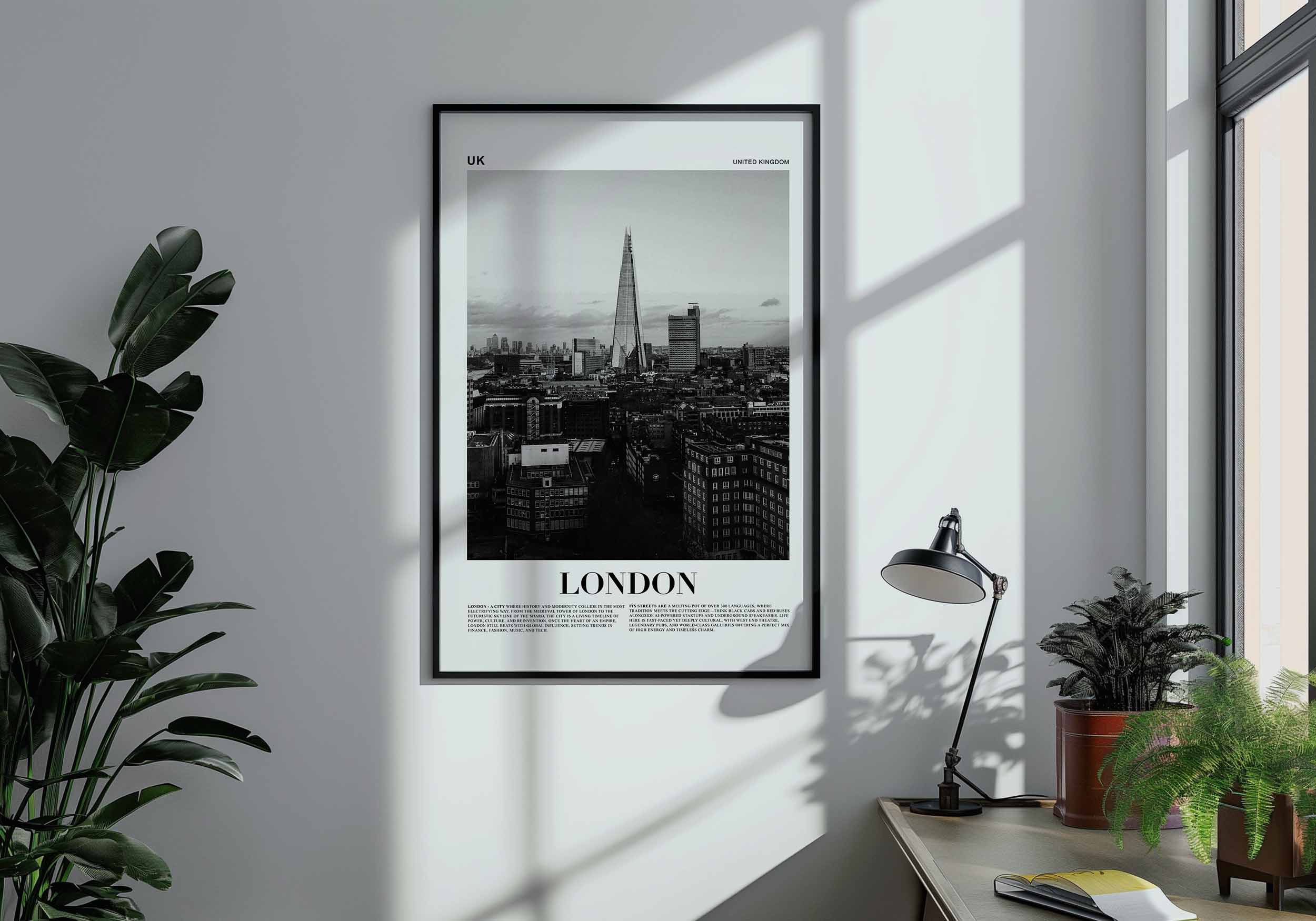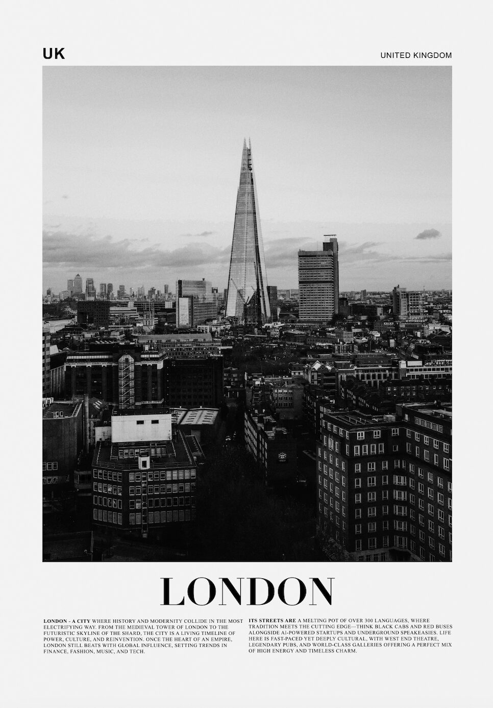Bilden är ett svartvitt fotografi av Londons skyline med The Shard som det dominerande inslaget. Bilden är tagen från en låg vinkel, vilket ger The Shard en imponerande närvaro och skapar en känsla av att byggnaden sträcker sig mot himlen. I förgrunden syns en del av Londons taklinje med blandade byggnader i olika höjder. Bilden är tagen under dagen och ljuset faller mjukt över staden, vilket ger en lugn och harmonisk känsla.