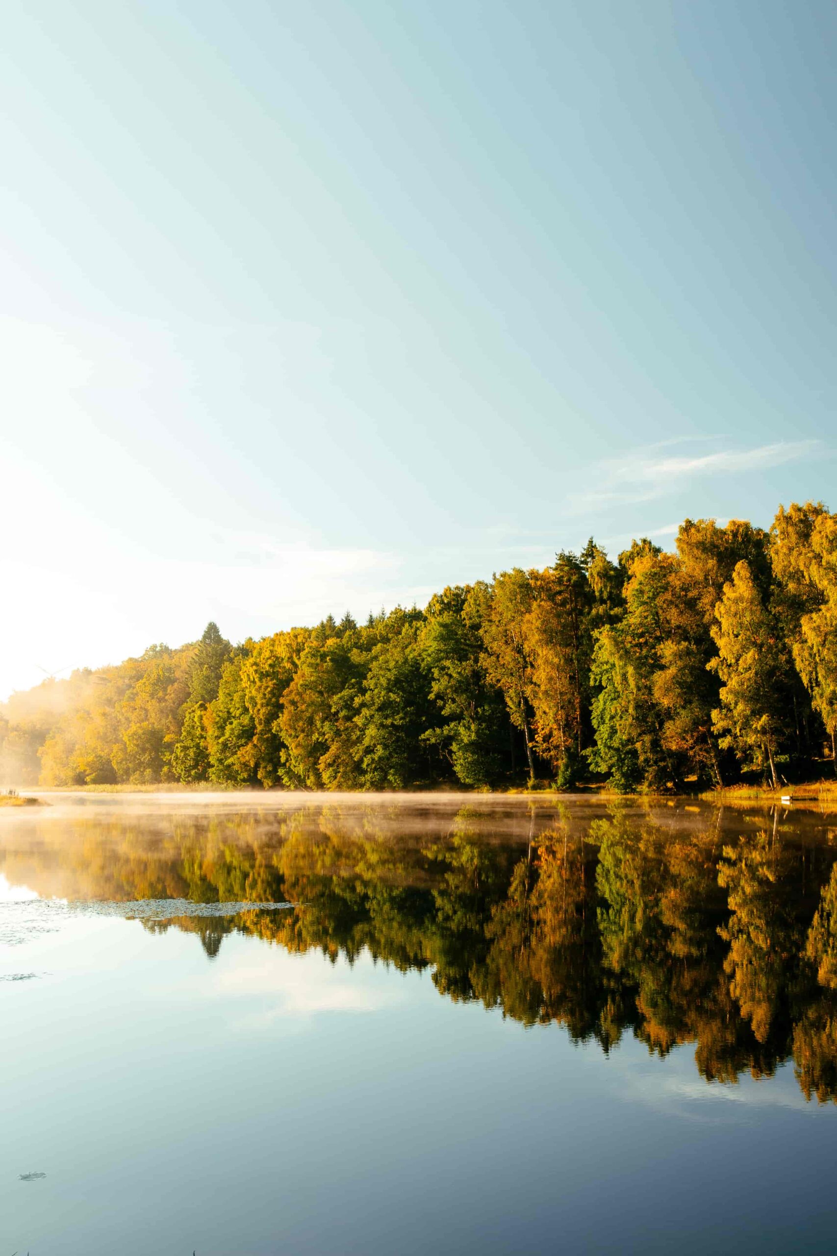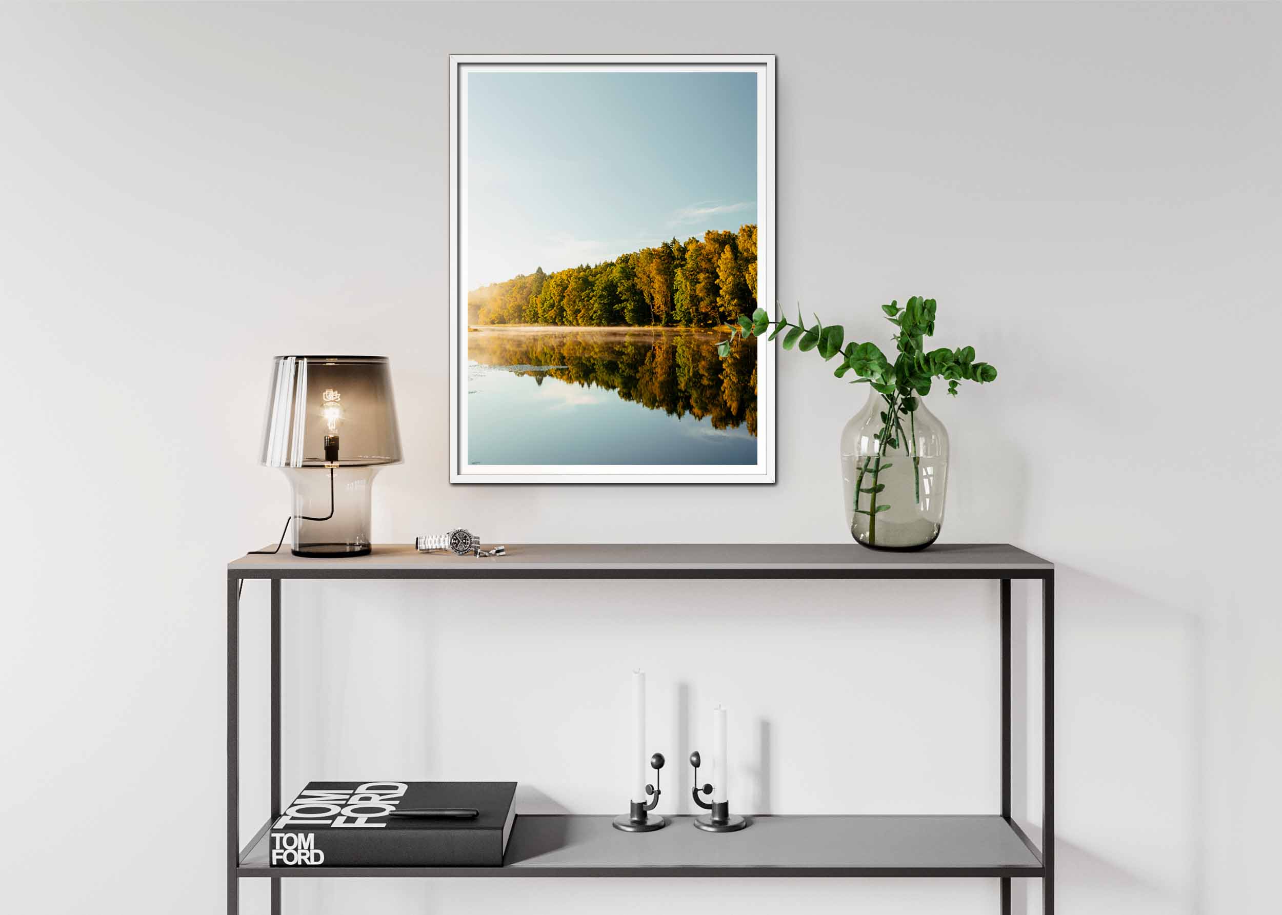 Postern visar en stilla sjö en tidig morgon där solens första strålar bryter igenom i vänstra kanten av bilden och skapar en magisk atmosfär. Soluppgångens ljus är varmt och gyllene, vilket kastar mjuka strålar över vattnet och omvandlar sjöns spegelblanka yta till en glittrande duk. En tunn, vit dimma ligger lågt över vattnet, vilket gör att hela scenen känns drömlik och fridfull. I bakgrunden sträcker sig mörka träd längs sjöns kant, deras silhuetter markerade mot den ljusnande himlen. Träden har börjat skifta färg till olika nyanser av gult, orange och rött, vilket ger en höstig ton till landskapet. Sjön är stilla, och några löv flyter på ytan, stilla och orörda. De långa skuggorna från träden och den låga solen sträcker sig över vattnet och skapar en harmonisk och rogivande komposition. Himlen är svagt rosa och ljusblå, vilket förstärker den tidiga morgonens fridfullhet. En perfekt poster för att fånga den fridfulla skönheten i naturen vid soluppgången.