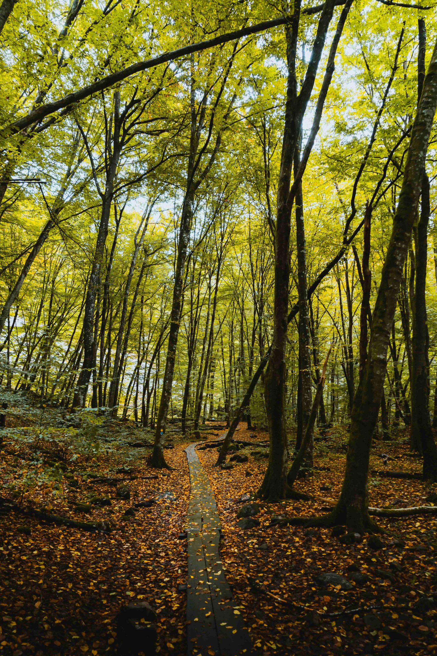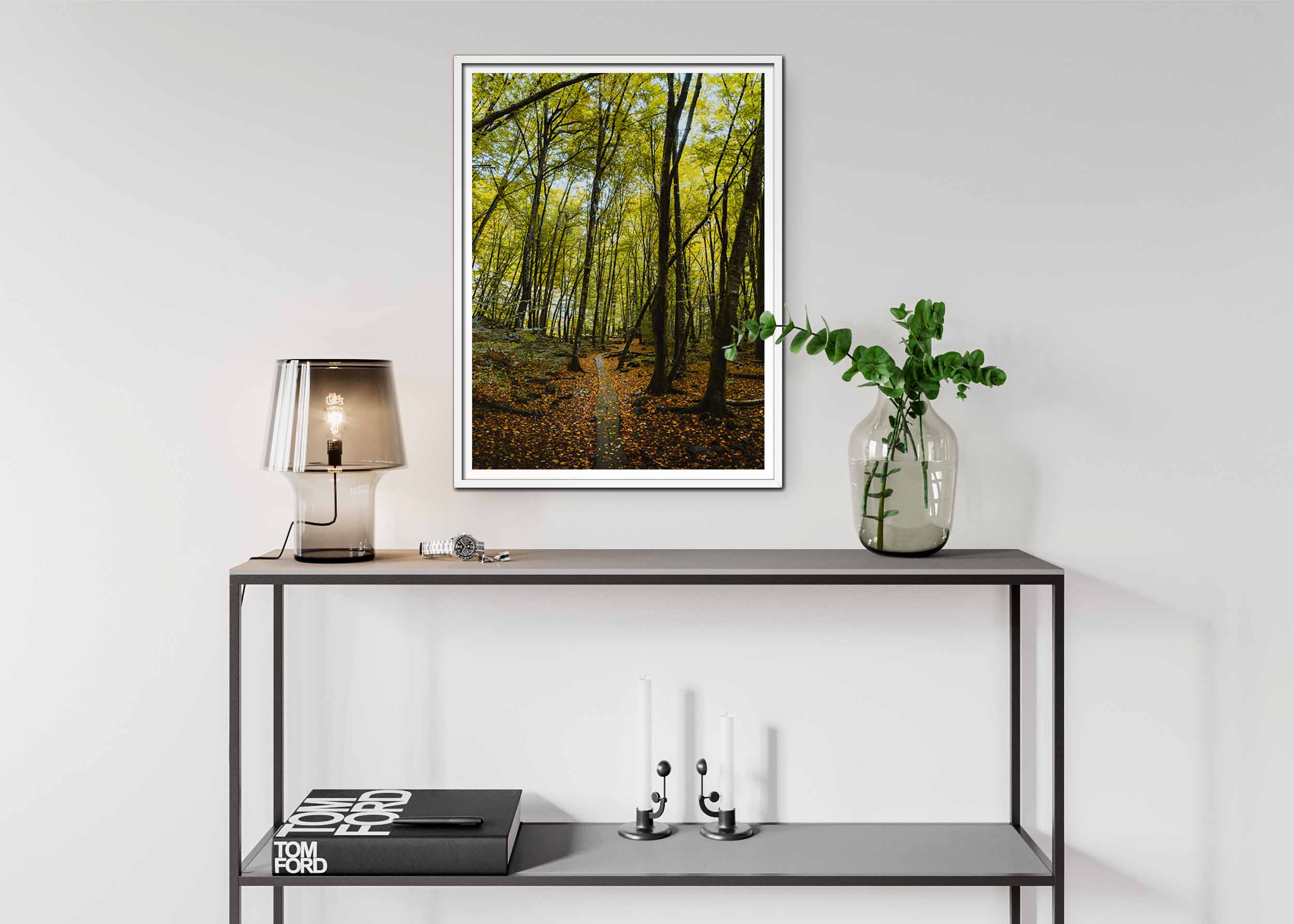 Bilden visar en lummig skog med höga träd som sträcker sina tunna, böjda grenar mot den ljusa himlen, vilket skapar ett naturligt tak av ljusgröna och gyllene blad. Ljuset som silas genom trädkronorna ger en drömlik och nästan magisk känsla, där varje gren och löv tycks vara badat i ett mjukt sken. På marken ligger ett täcke av orange och gula höstlöv som lyser upp den mörka jorden och markerar årstidens gång. En smal, träbelagd stig slingrar sig fram genom skogen, vilket bjuder in betraktaren att följa den djupare in i detta vackra, höstfärgade landskap. Stigen och färgerna skapar en harmonisk kontrast mellan mörka stammar och ljusa lövverk, vilket framhäver skogens naturliga skönhet och lugn.
