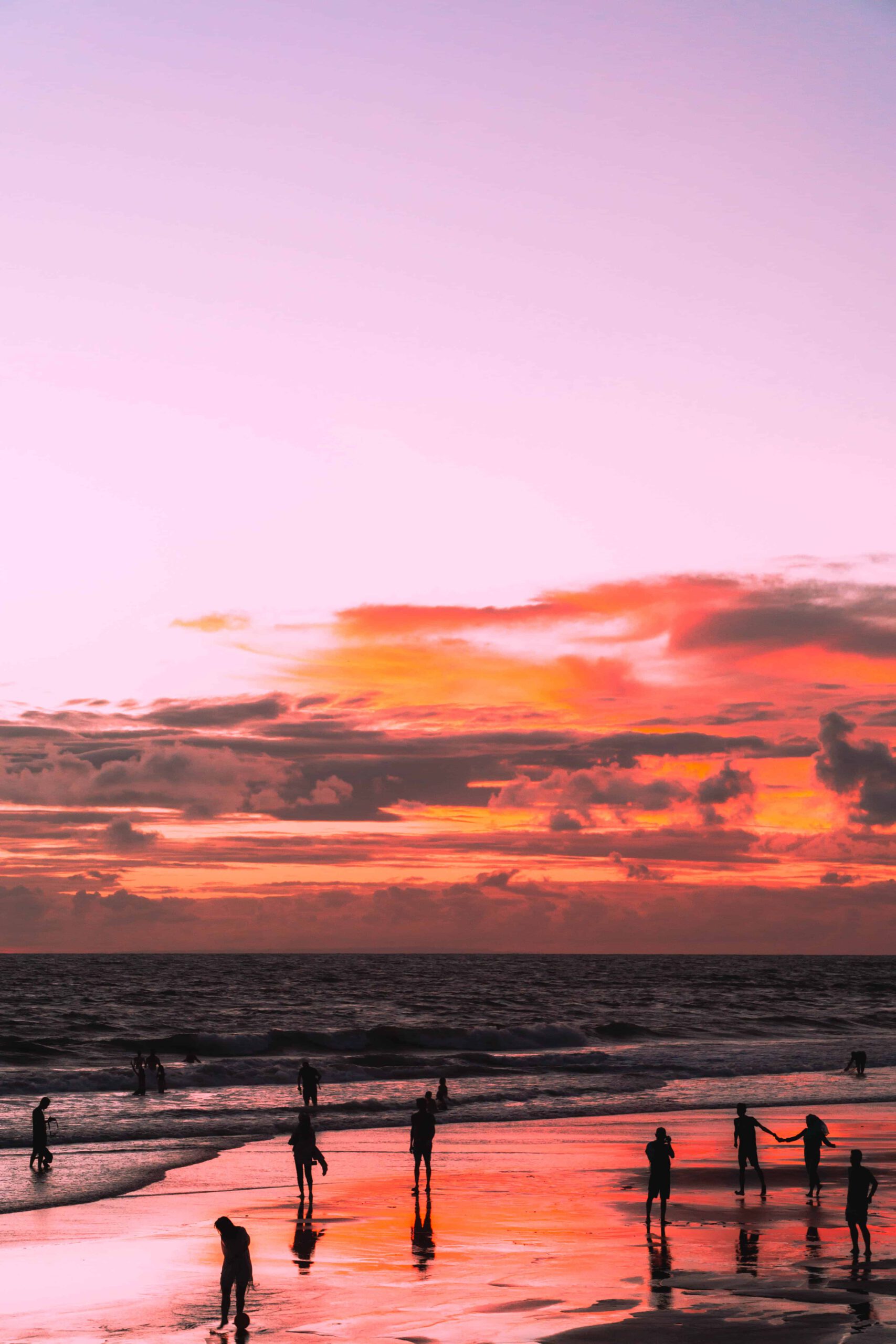 Bilden fångar en magisk solnedgång över ett öppet hav, där himlen är färgad i intensiva nyanser av rosa, orange och purpur. Molnen sträcker sig som penseldrag över horisonten och skapar en dramatisk kontrast till det mörka, stillsamma vattnet. I förgrunden syns en strand där människor promenerar, står och samtalar, med sina silhuetter som speglas i det våta sanden, vilket förstärker den varma och inbjudande stämningen. Vågorna rullar försiktigt in mot stranden, och skuggorna av människorna framhäver en känsla av gemenskap och lugn under den gyllene timmen.