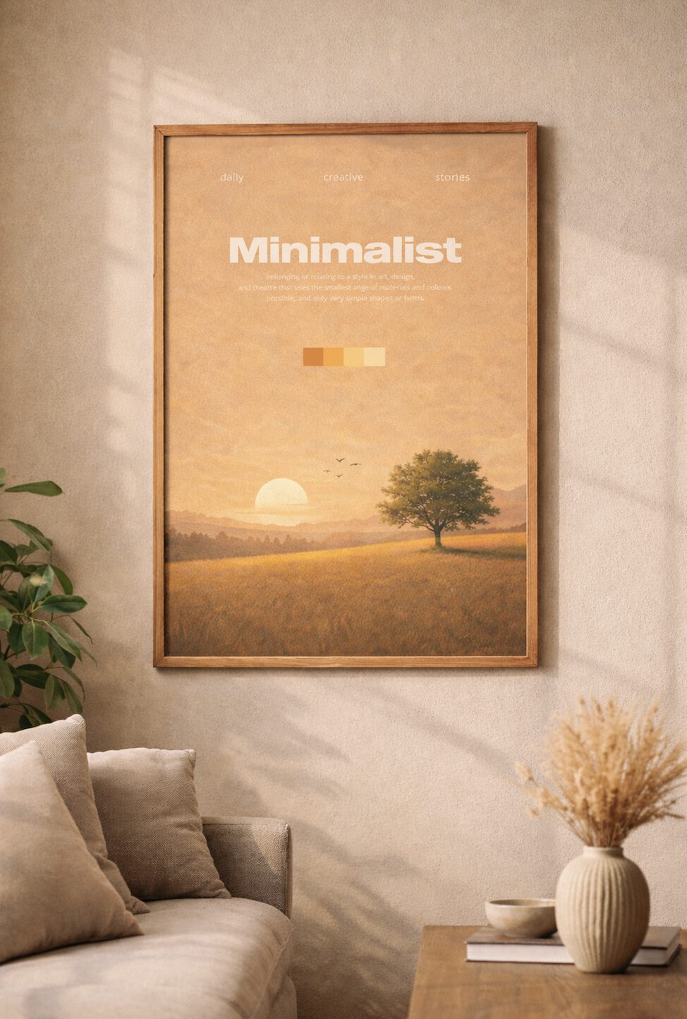 Denna poster förmedlar en varm och rofylld känsla med ett minimalistiskt landskap i gyllene toner. Motivet visar ett ensamt träd på en öppen äng som badar i mjukt solljus från en låg sol vid horisonten. I bakgrunden syns mjuka bergsformer och några fåglar som flyger över landskapet, vilket skapar en känsla av lugn, frihet och stillhet. Färgskalan i varma nyanser av guld, beige och mjuk orange gör att postern passar perfekt i ett vardagsrum, sovrum eller arbetsrum där man vill skapa en harmonisk och varm atmosfär med naturinspirerad känsla.