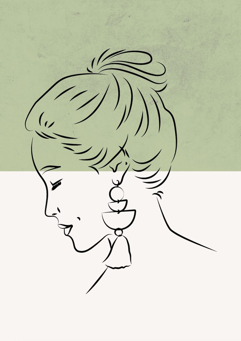 En stor, geometrisk örhänge hänger ned från örat och blir en tydlig blickpunkt i designen. Bakgrunden är delad i två färgfält: övre delen i en dämpad grön ton med textur och nedre delen i en mjukt beige ton. Tillsammans skapar färgkombinationen en harmonisk och modern känsla.