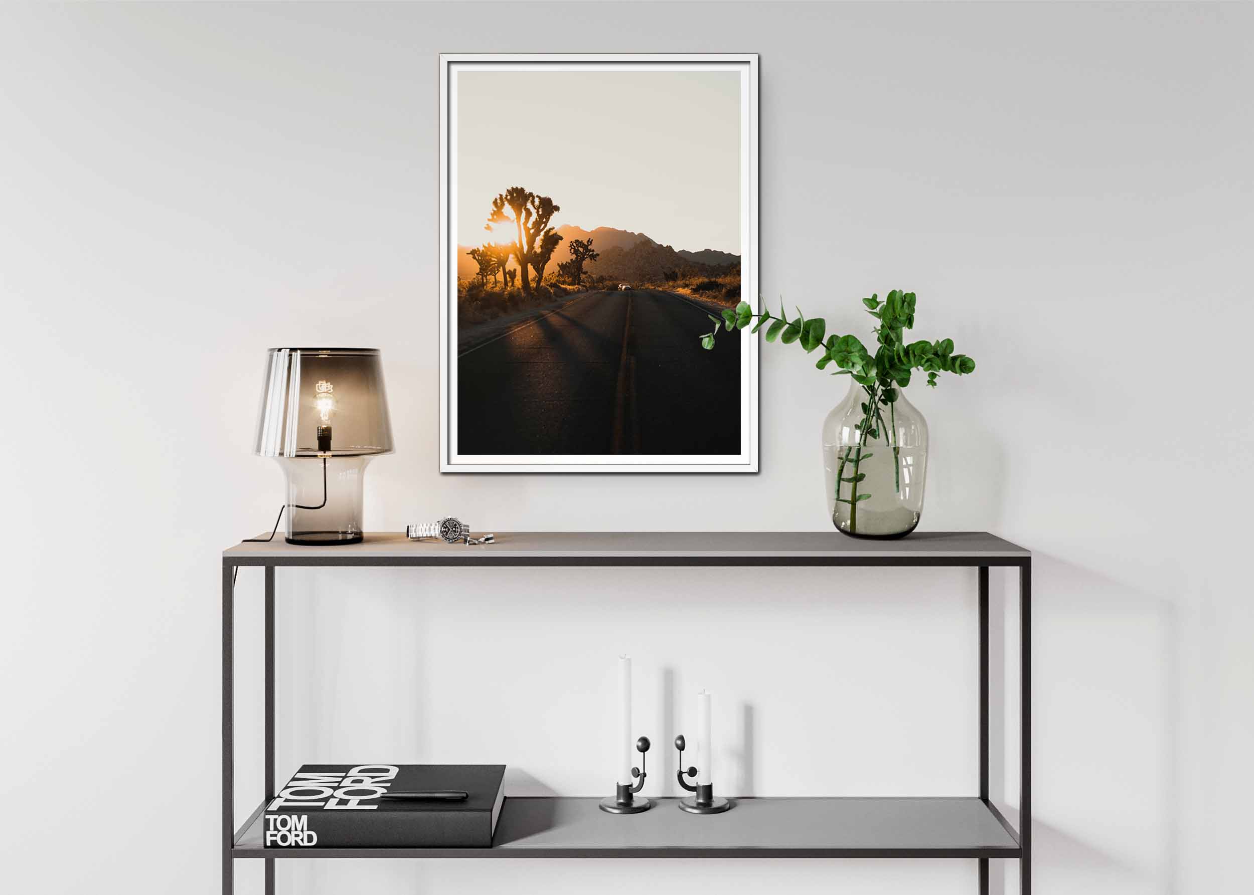 Solens strålar bryter igenom ett moln av damm och skapar ett bländande sken över den öde vägen som slingrar sig fram genom det karga ökenlandskapet. I förgrunden står en grupp majestätiska Joshua Trees siluetterade mot den brinnande himlen. Deras knotiga grenar sträcker sig mot himlen som om de ville nå solen. Vägen, som verkar sträcka sig ända till horisonten, är omgiven av kaktusar och andra ökenväxter. I fjärran reser sig en bergkedja som skymmer den klarblå himlen. Bilden fångar en känsla av oändlighet och frihet, samtidigt som den påminner om naturens råa skönhet.