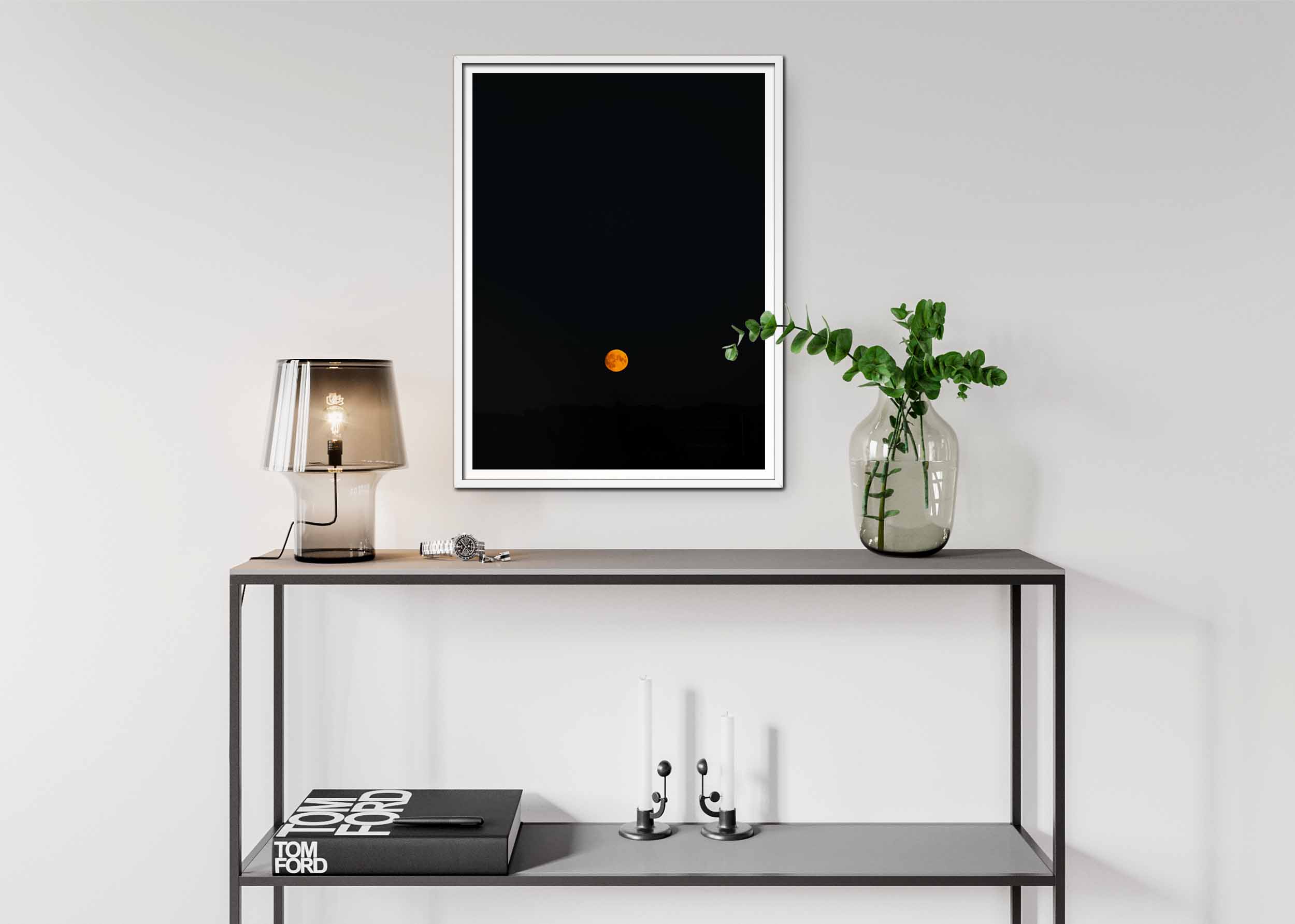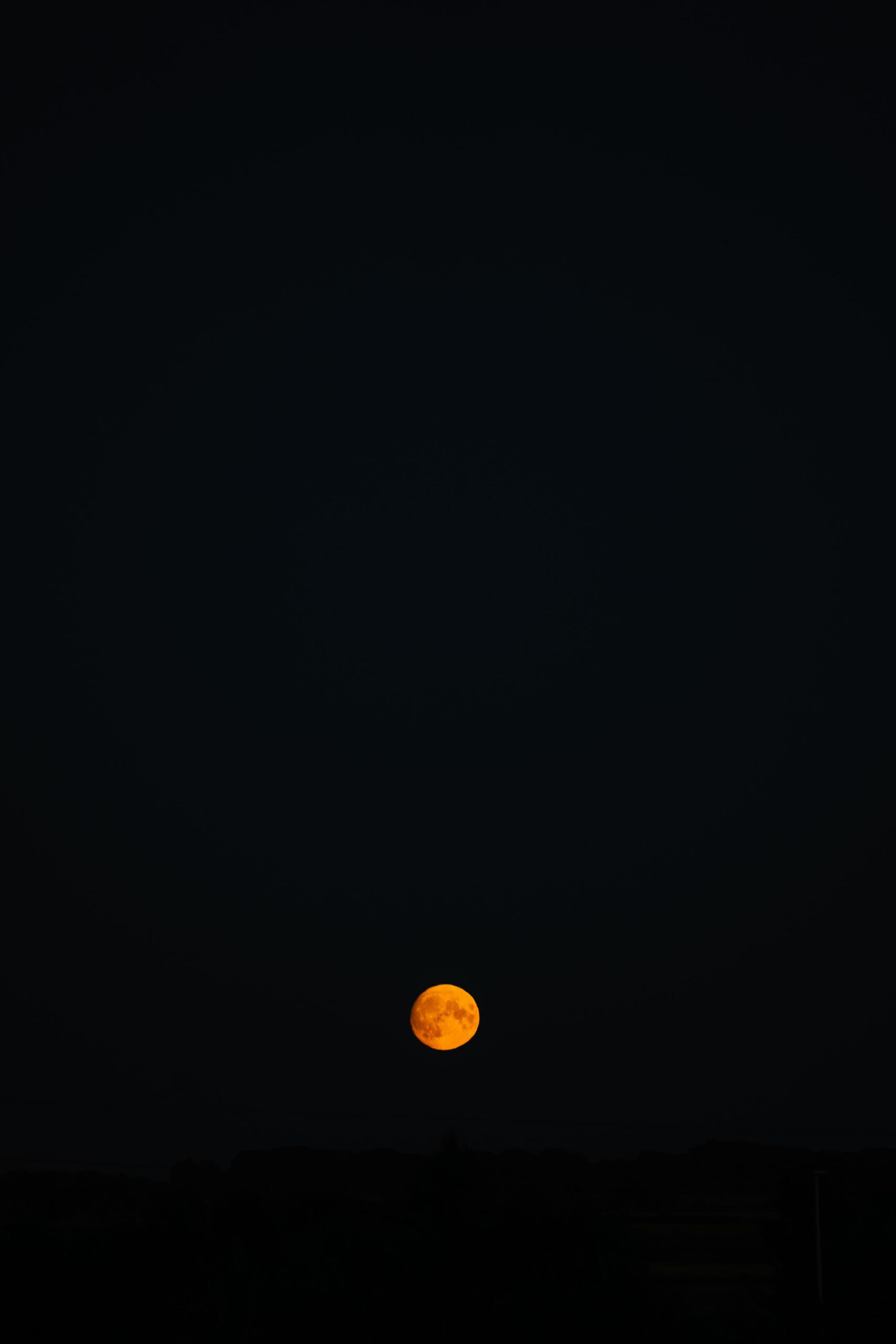 Bilden fångar en stor, orange måne som hänger lågt på en mörk natthimmel. Månen lyser starkt och kastar ett varmt sken över det omgivande landskapet, som är mörkt och oskarpt i bakgrunden. Månytan är detaljerad och visar tydligt kratrar och andra formationer. Bildens övergripande känsla är lugn och mystik, med månen som det enda ljuskällan och fokuspunkten.