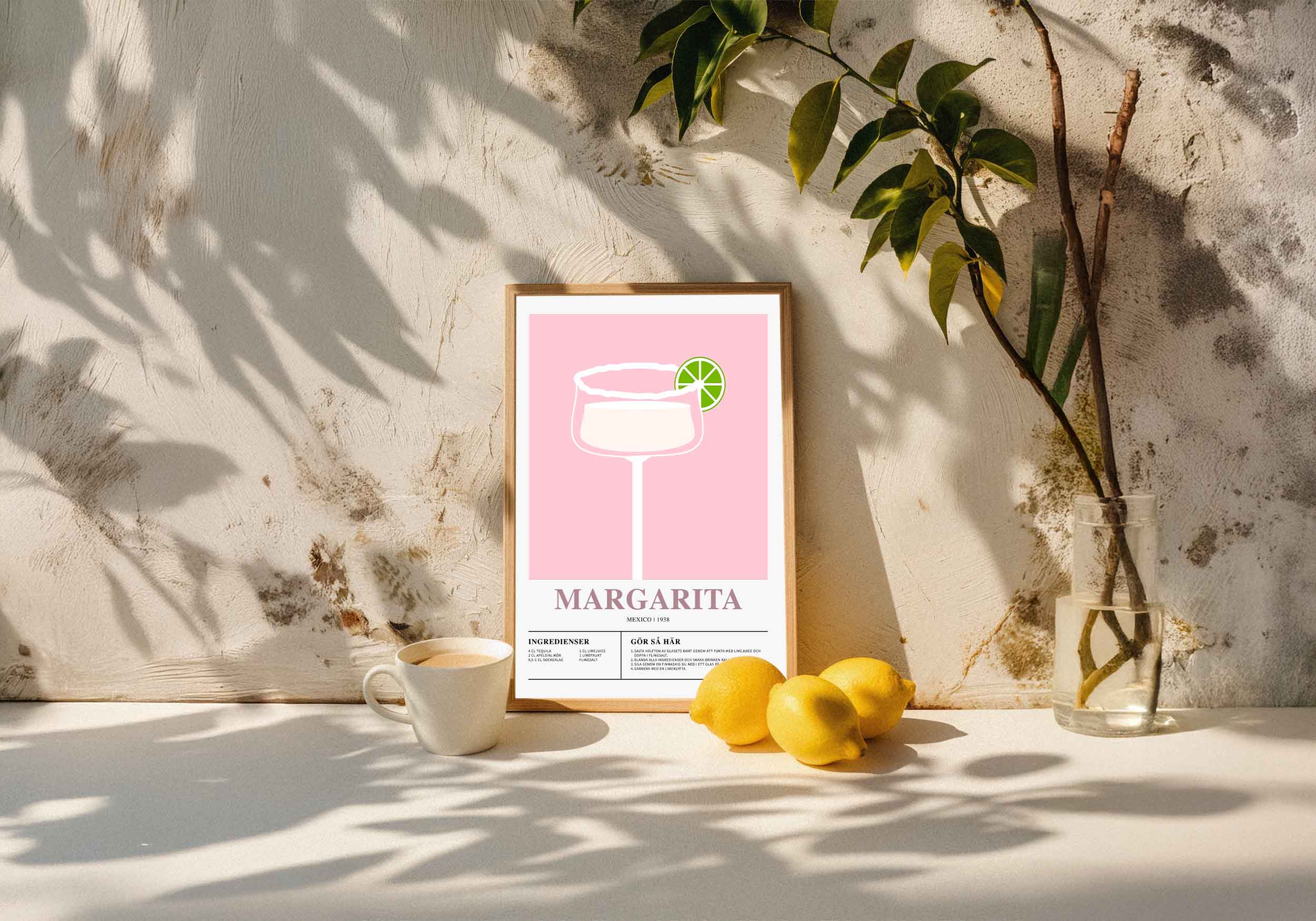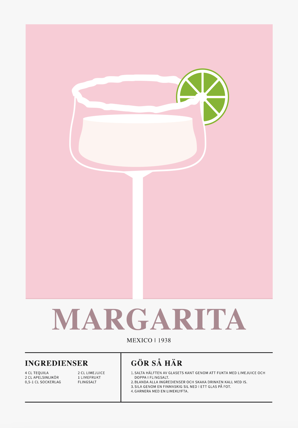 Poster som visar Ett margaritaglas fyllt med en ljusgul vätska mot en ljus bakgrund. Glaset är dekorerat med en limeskiva och saltkant. Texten "Margarita" och "Mexico 1938" syns tydligt.