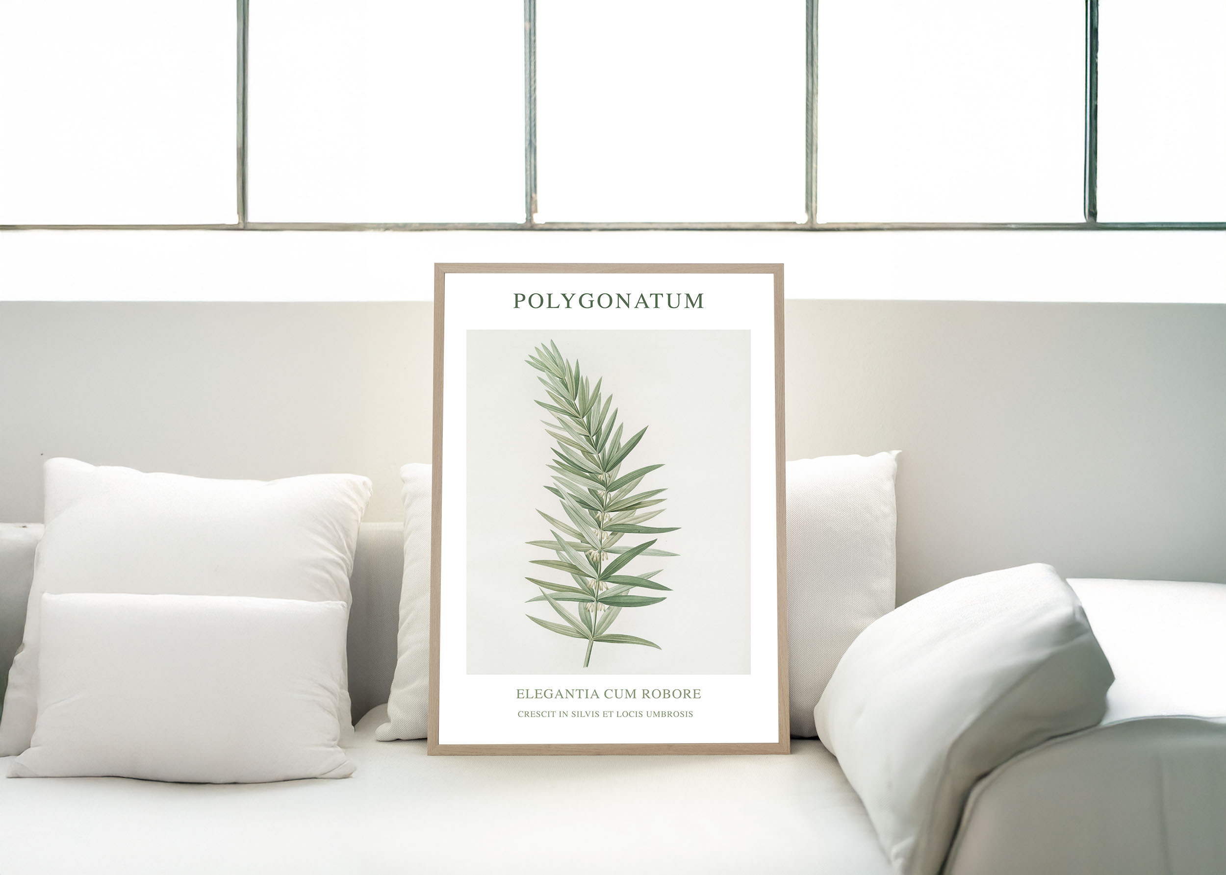 Mot en ljus, nästan vit bakgrund sträcker sig en elegant kvist av konvalj. De långa, smala bladen är tätt packade längs stjälken och har en mjuk, glänsande yta. Under bladen döljer sig små, klockformade, vita blommor. Blommorna har en delikat struktur och sprider en ljuvlig doft. Ljuset faller mjukt över blommorna och bladen, vilket ger bilden en lugn och harmonisk känsla. Bilden har en klassisk och botanisk stil, som om den är hämtad ur en gammal herbarium.