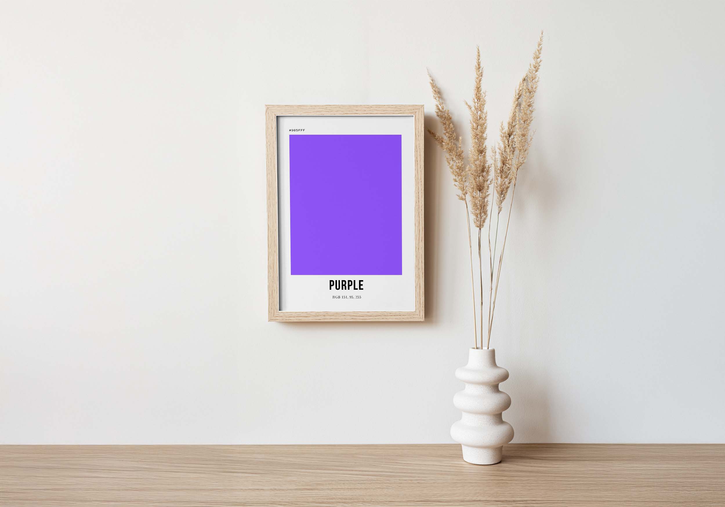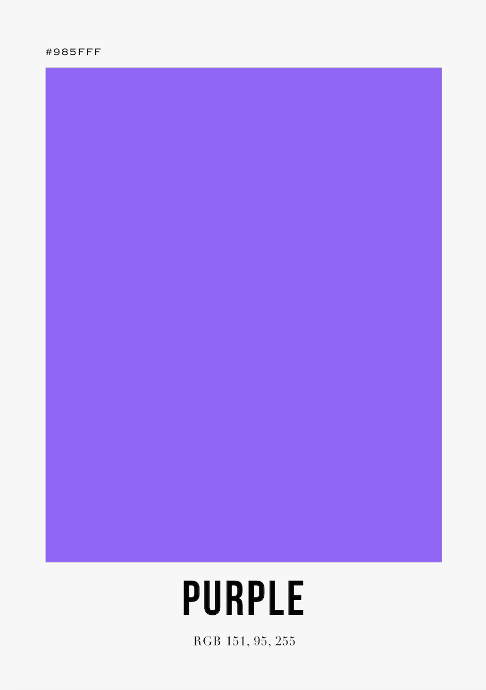 Bilden är en enkel, men effektfull representation av färgen lila. Den består av en stor, kvadratisk yta fylld med en intensiv lila färg, definierad av hex-koden #985FFF. Den lila färgen är djup och mystisk, och fyller hela bilden. Längst ned på bilden finns ordet ”PURPLE” skrivet i svart, fet stil, tillsammans med RGB-värdena för färgen. Bakgrunden är helt vit, vilket skapar en skarp kontrast till den lila färgen och gör den till bildens absoluta fokus.