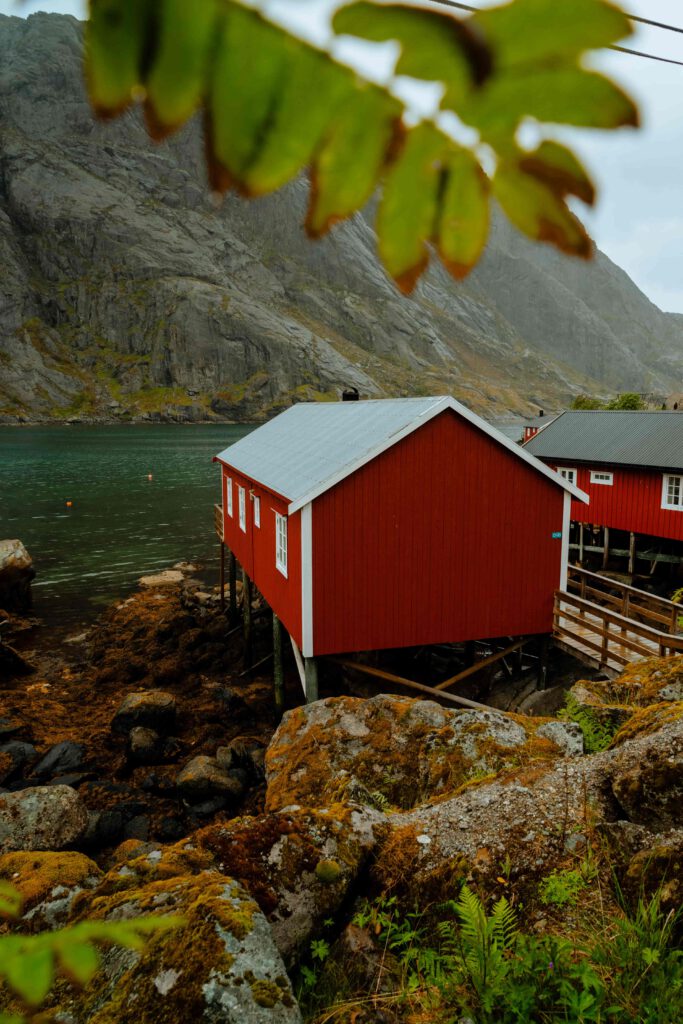 Bilden fångar en idyllisk vy av en röd stuga belägen på en stenig kust. Stugan står på pålar över vattnet, vilket ger den ett flytande utseende och understryker dess närhet till havet. Den röda färgen på stugan kontrasterar vackert mot det gröna landskapet och det blå vattnet. Taket är täckt av grå skiffer och fönstren är små och fyrkantiga, vilket ger stugan en klassisk och traditionell känsla. I förgrunden syns stora klippor täckta av mossa och gröna växter, vilket skapar en naturlig ram runt stugan. I bakgrunden reser sig ett majestätiskt berg med karga klippväggar, vilket ger bilden en känsla av både lugn och äventyr. En liten båt ligger förtöjd vid bryggan, vilket antyder på ett liv nära havet.