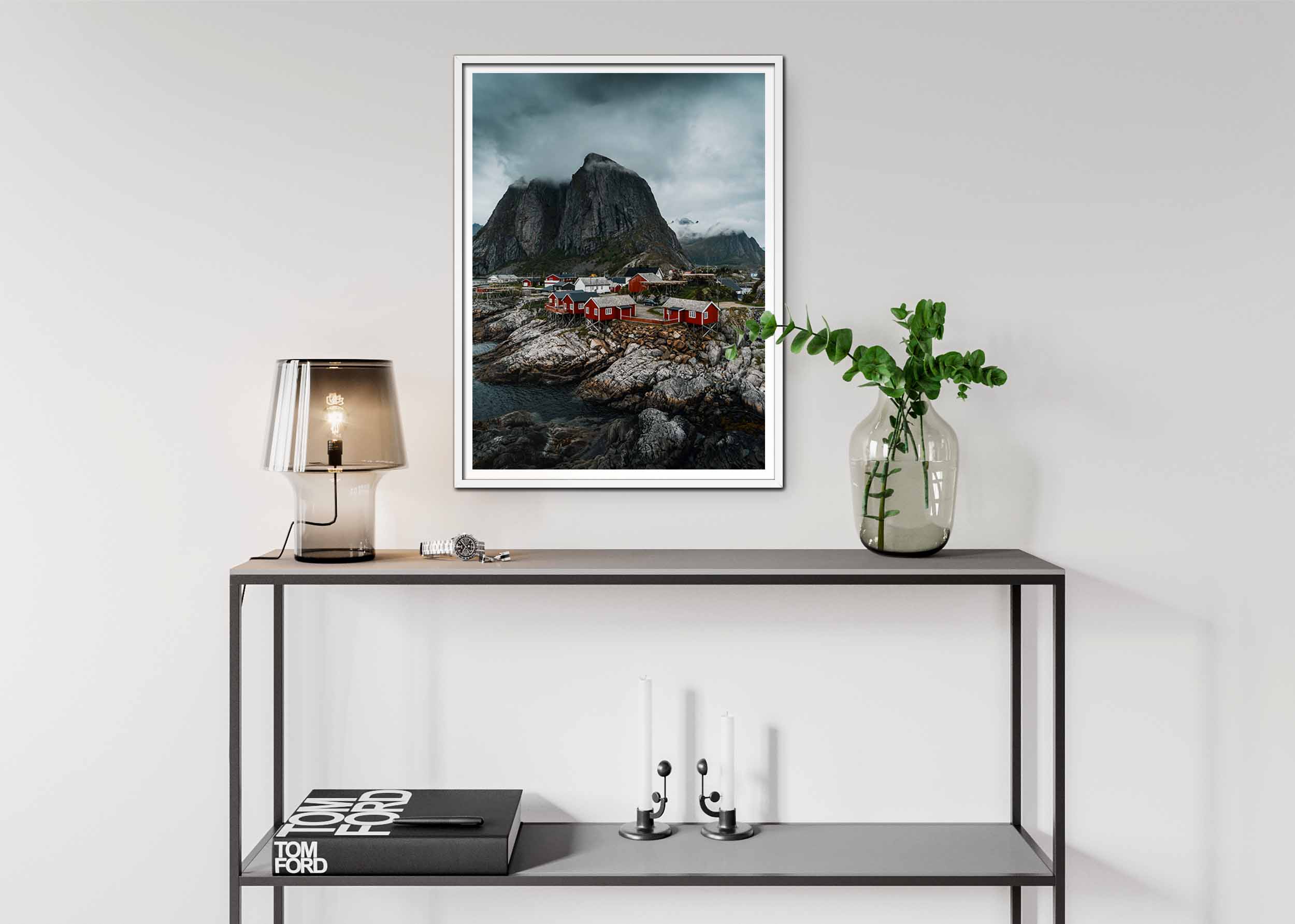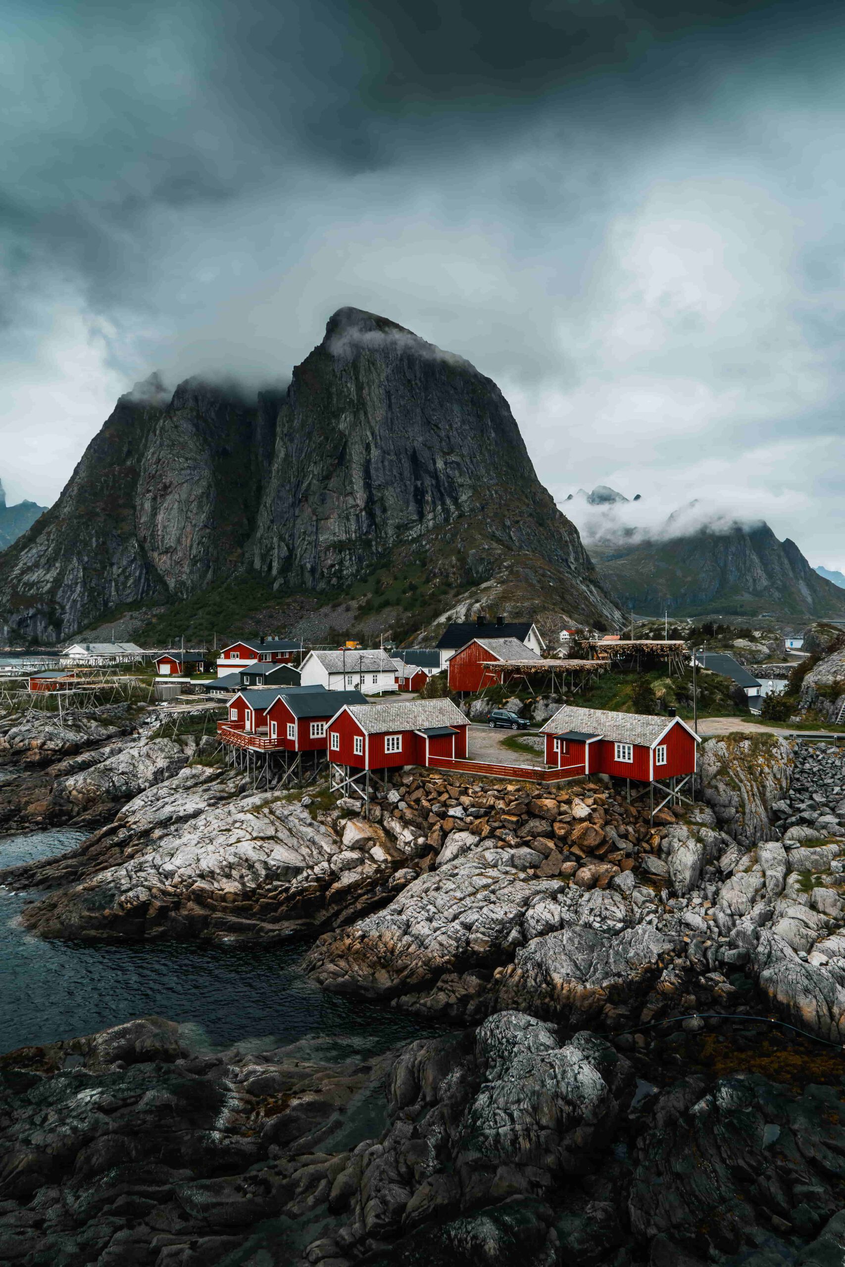 Bilden fångar en idyllisk fiskeby i det norska landskapet. Små röda stugor med vita knutar ligger pittoreskt utspridda på en klippig udde, deras färgglada fasader som sticker ut mot den gråa himlen och de mörka bergen i bakgrunden. Bergen reser sig majestätiskt över byn, deras toppar delvis dolda av ett tjockt molntäcke som ger en känsla av mystik och dramatik. Vattnet som omger byn är stilla och speglar himlen och bergen, vilket skapar en lugn och harmonisk atmosfär. Bilden är tagen från en något upphöjd position, vilket ger betraktaren en känsla av att titta ner på byn och beundra dess skönhet.